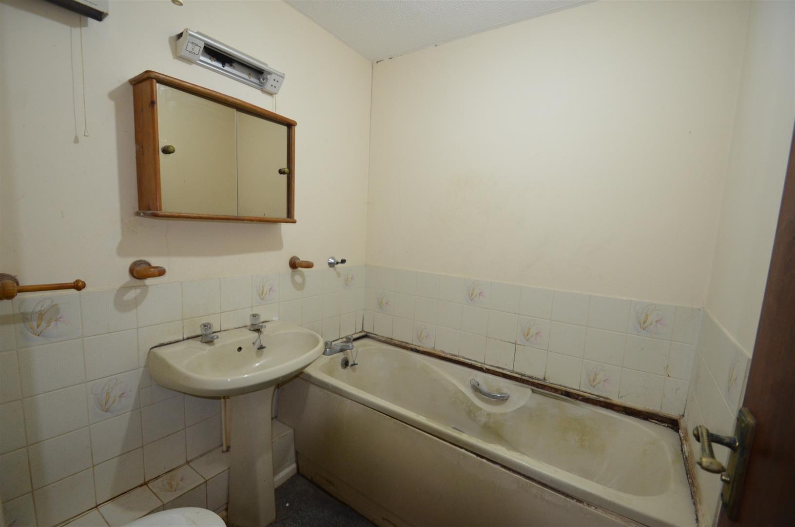 Suite comprising of panel enclosed bath, low level w.c, wash hand basin, part tiled walls.