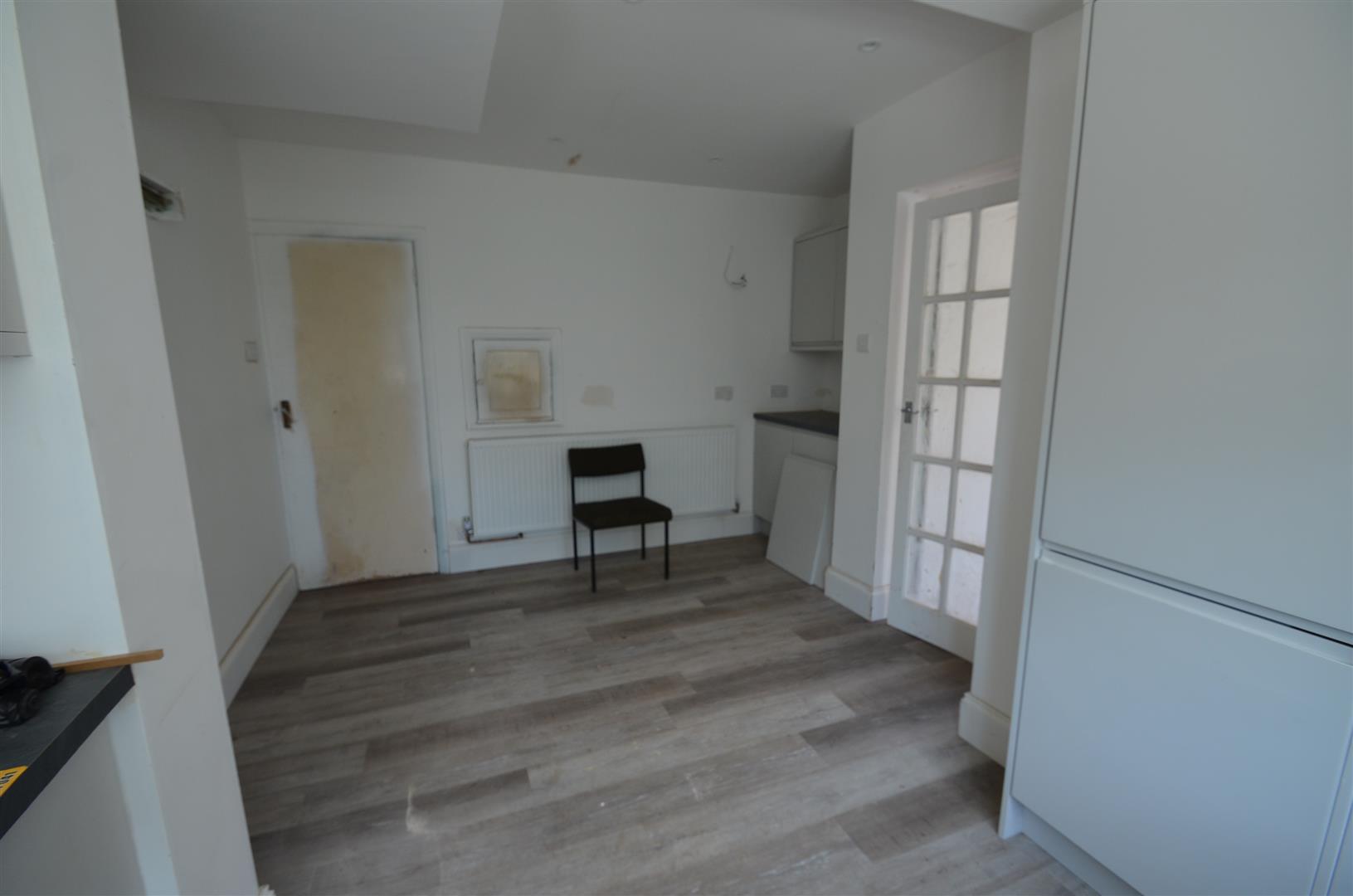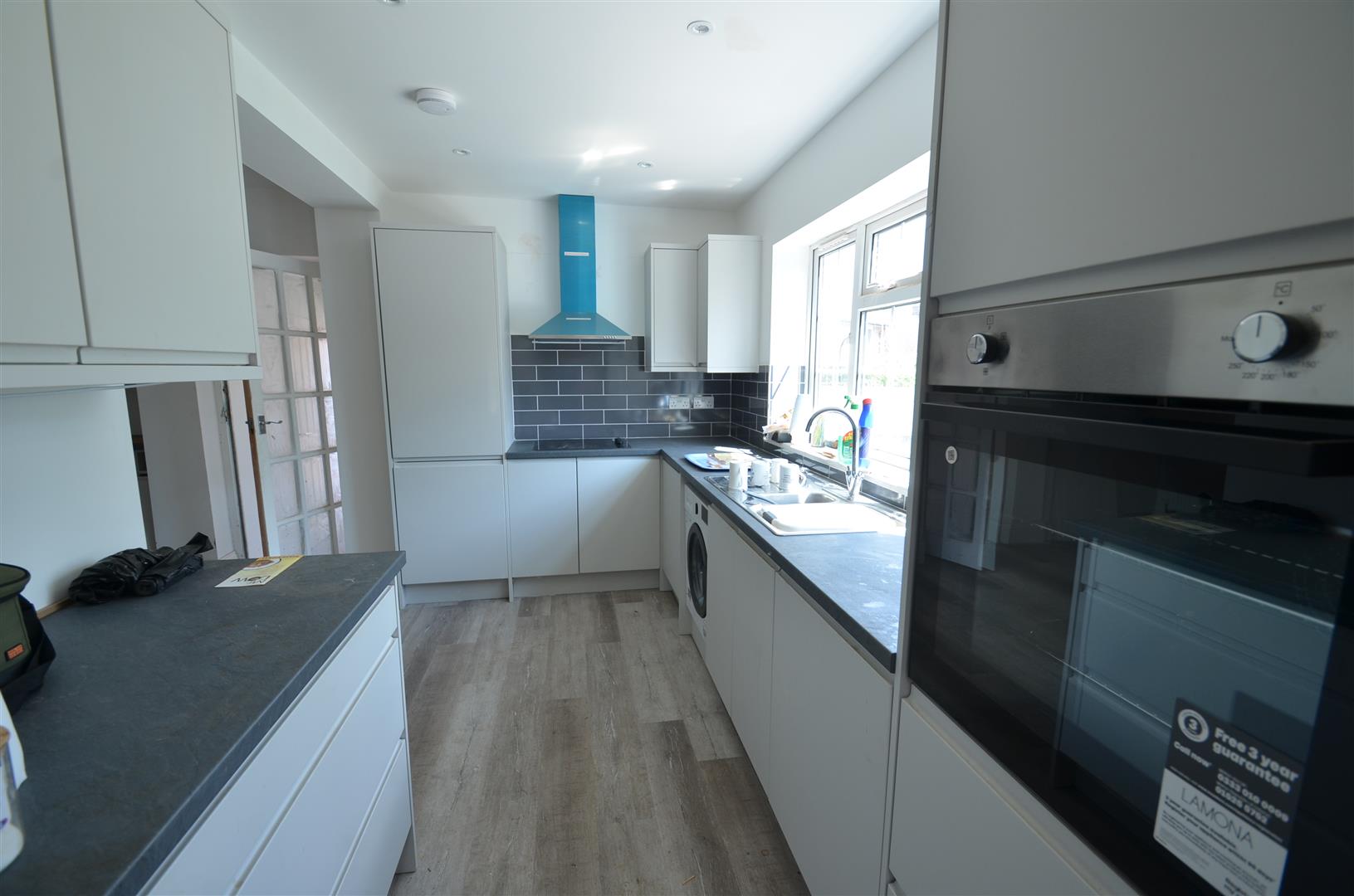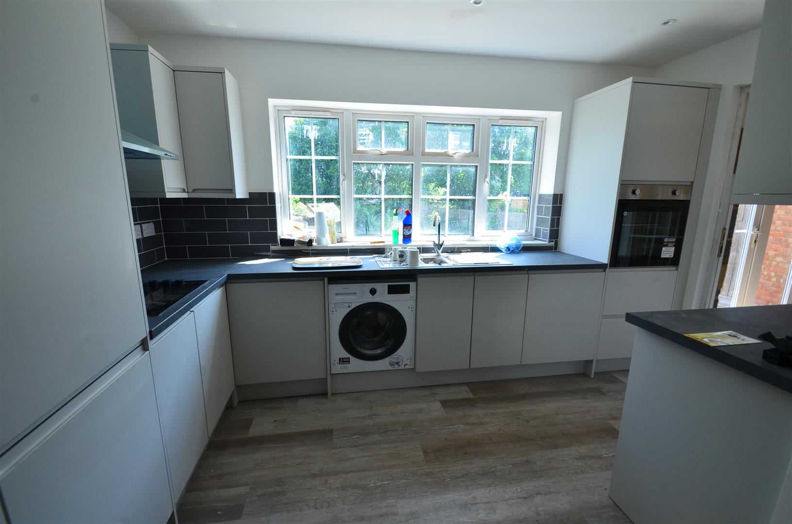 Recently fitted kitchen with a range of base and eye level units with roll top work surfaces, one and a half stainless steel sink unit with mixer tap, integrated eye level oven, integrated hob with stainless steel extractor hood over, integrated fridge/fr