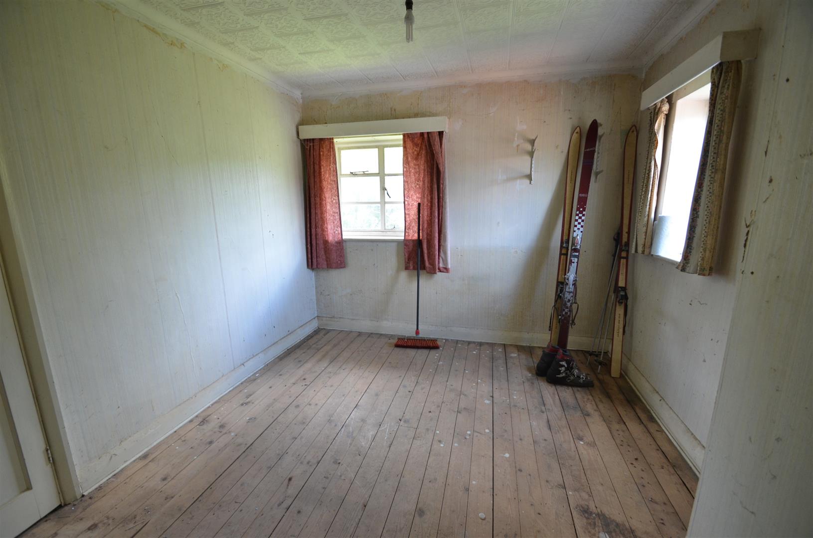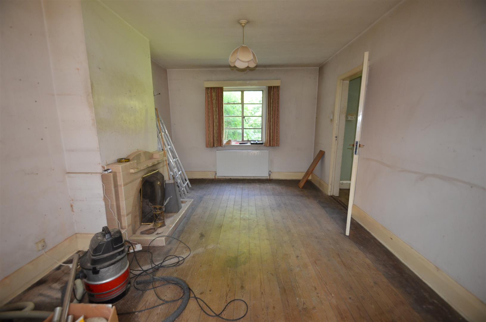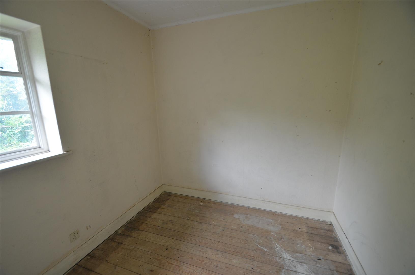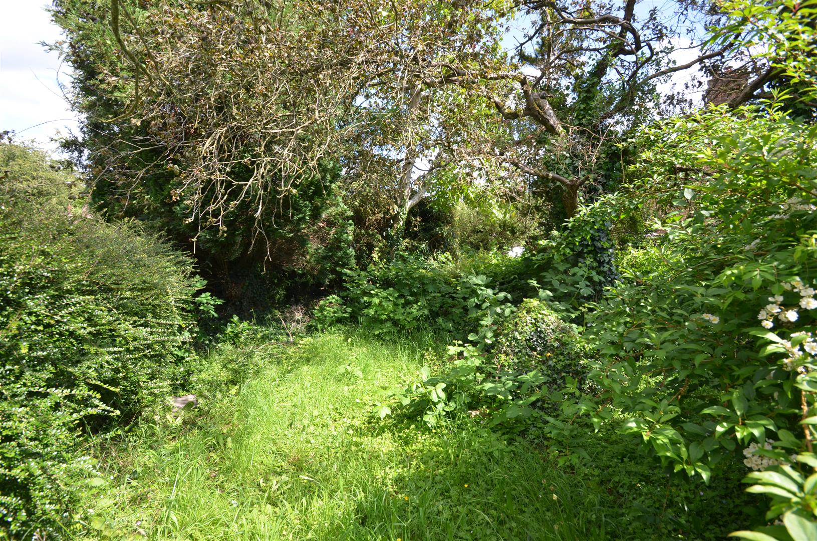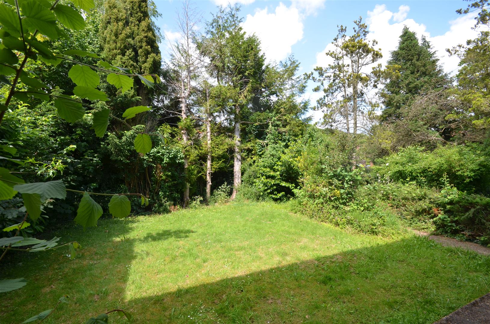 Driveway leading to garage and providing off road parking, rest laid mainly to lawn with a variety of mature trees and shrubs, gated access to rear.