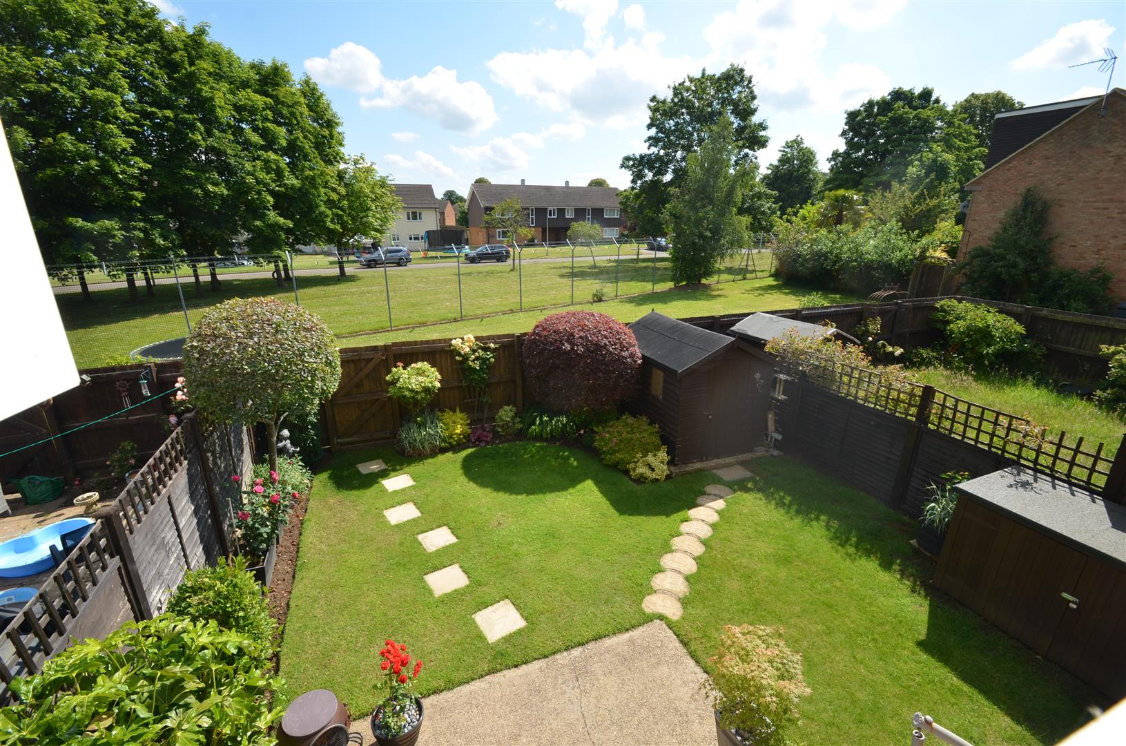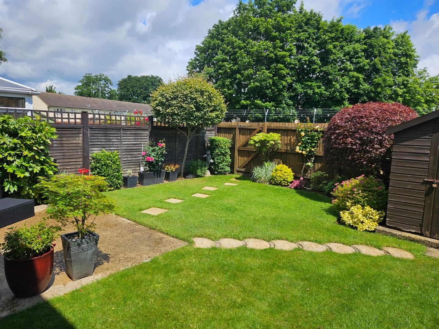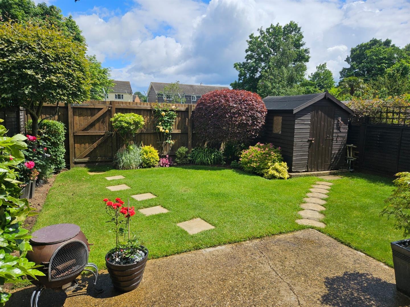 A fully enclosed rear garden mainly laid to lawn with patio area, well stocked flower bed borders, garden shed, gated access to rear.