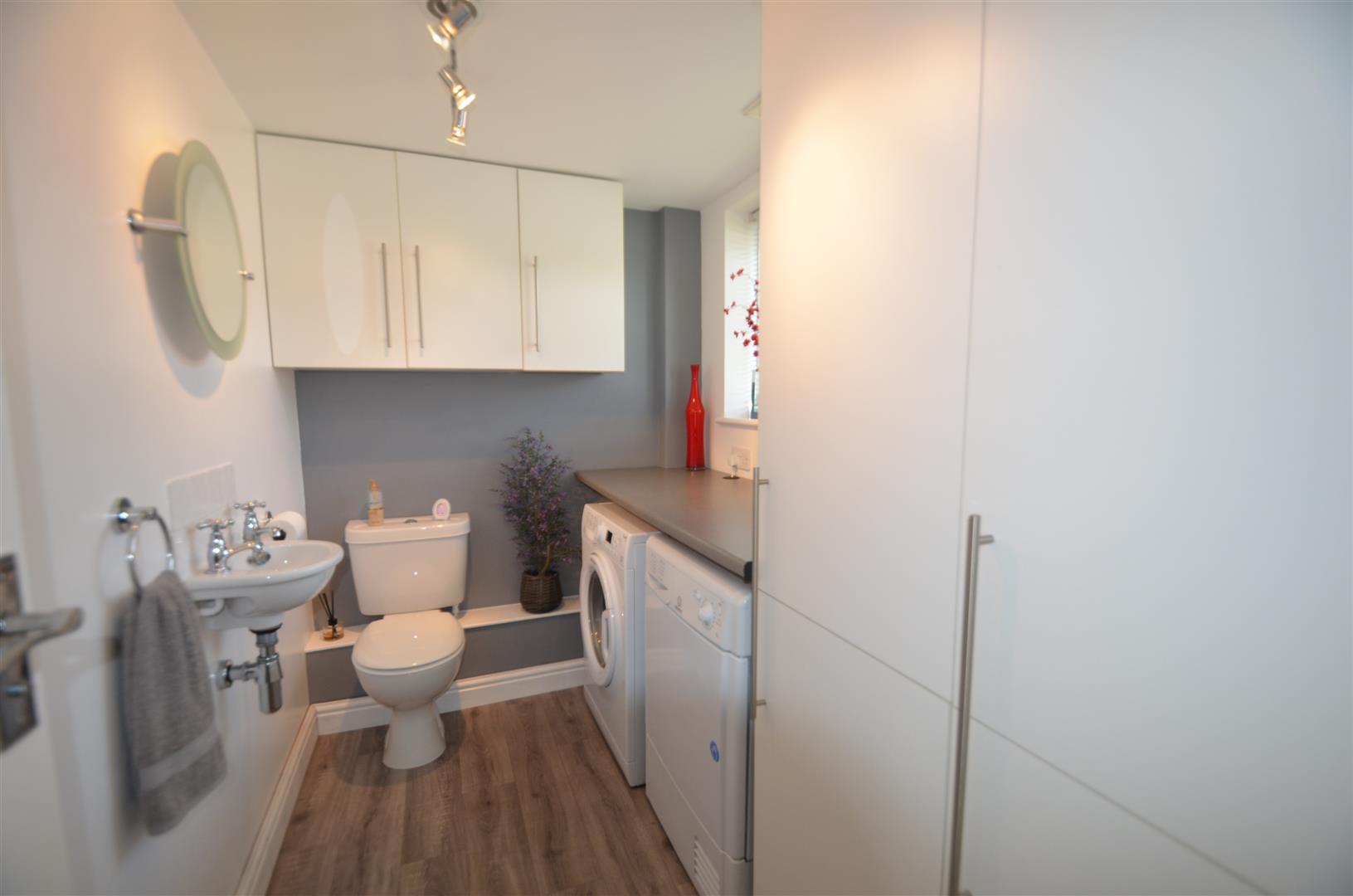 Fitted base and wall mounted unit with roll top work surfaces, plumbing and space for washing machine and tumble dryer, low level w.c, wall mounted wash hand basin, window to front.