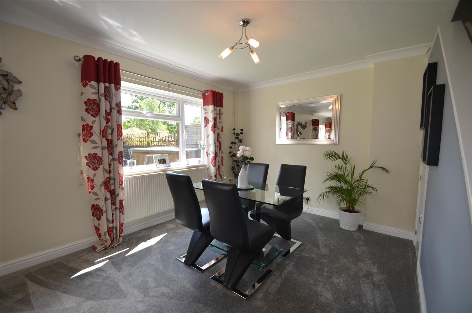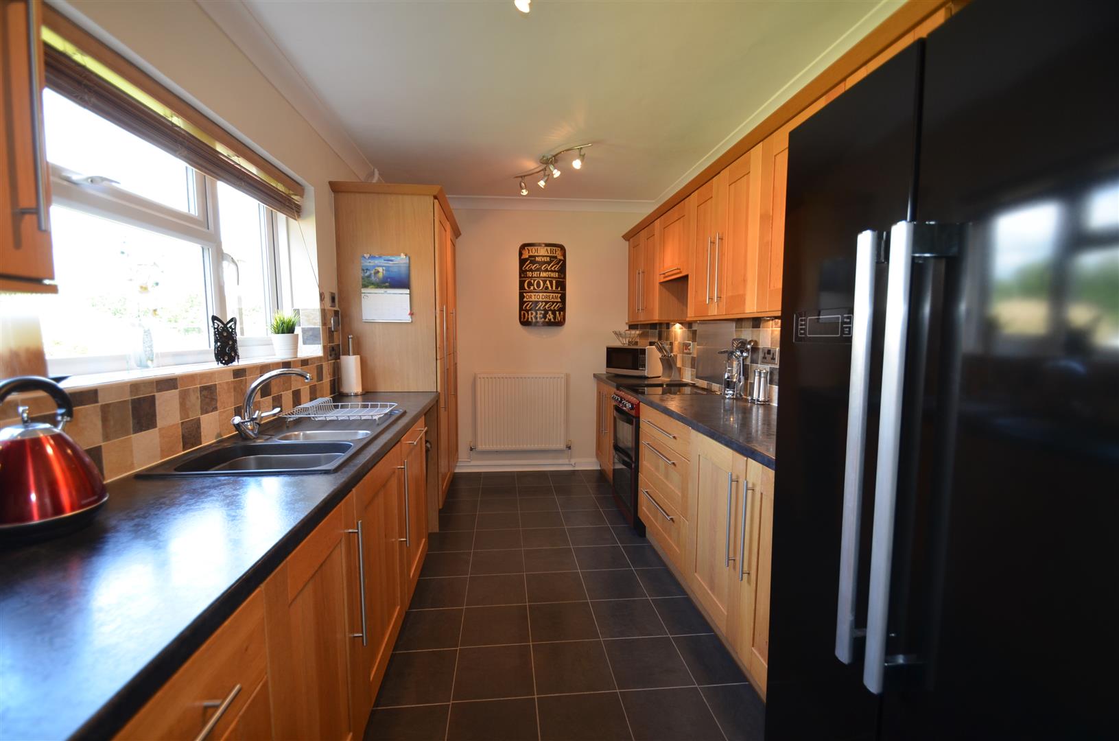 A well fitted kitchen with a range of base and eye level units with roll top work surfaces, one and a half sink unit with mixer tap, tiled splash back, integrated dishwasher, cupboard housing wall mounted boiler, radiator, window to front.
