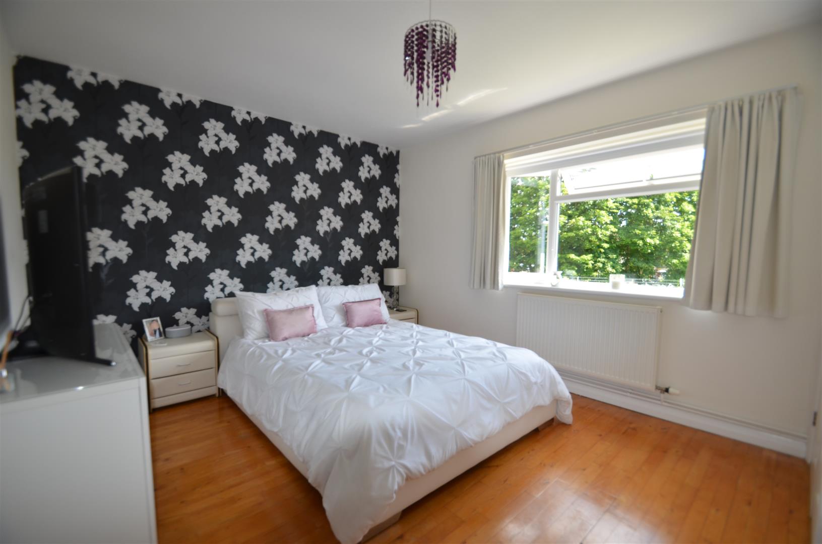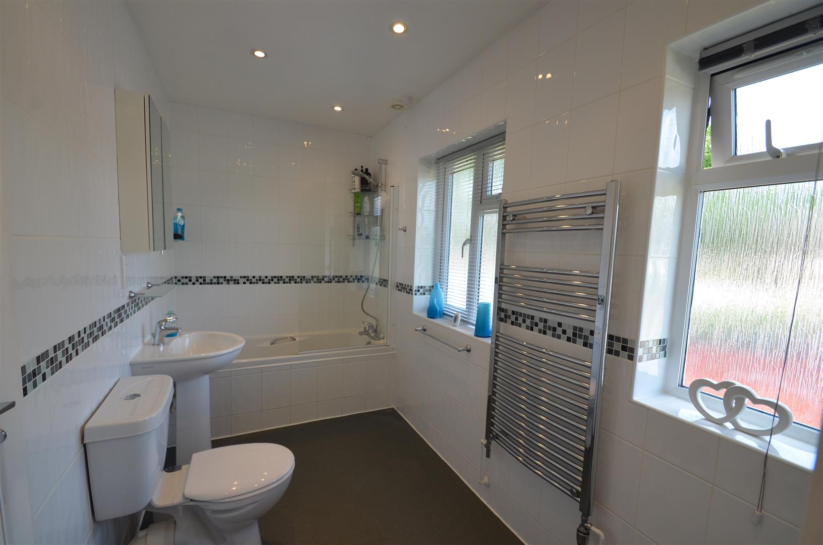 White suite comprising of panel enclosed bath with mixer tap and wall mounted shower attachment, glass shower screen, low level w.c, pedestal wash hand basin, fully tiled walls, two windows to front, heated towel rail, storage cupboard.