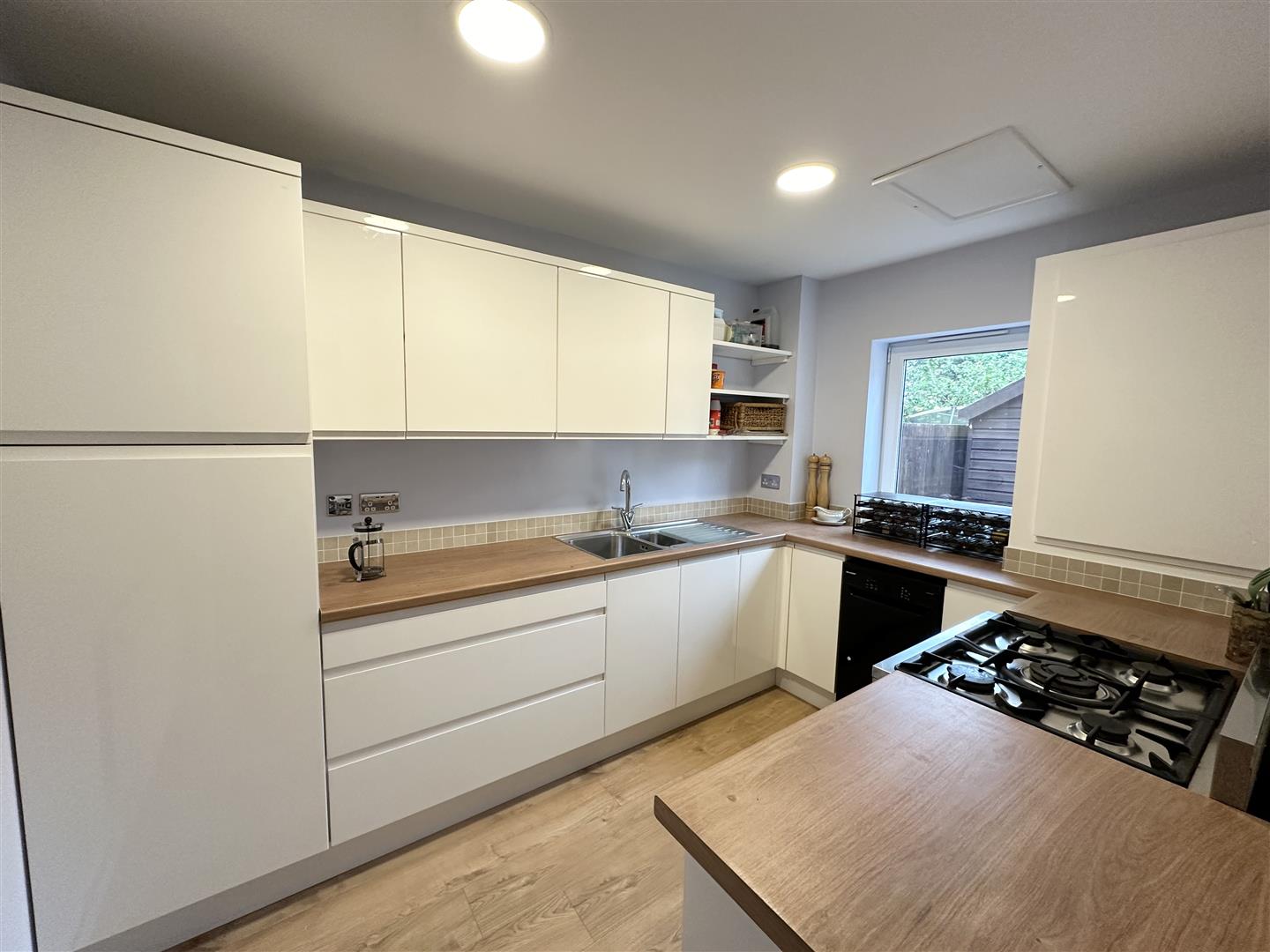 Fitted kitchen with a range of base and eye level units, with roll top work surfaces, gas hob and cooker, one and a half stainless steel sink unit with mixer tap, plumbing for washing machine, integrated fridge/freezer, uPVC window to rear, under stairs s