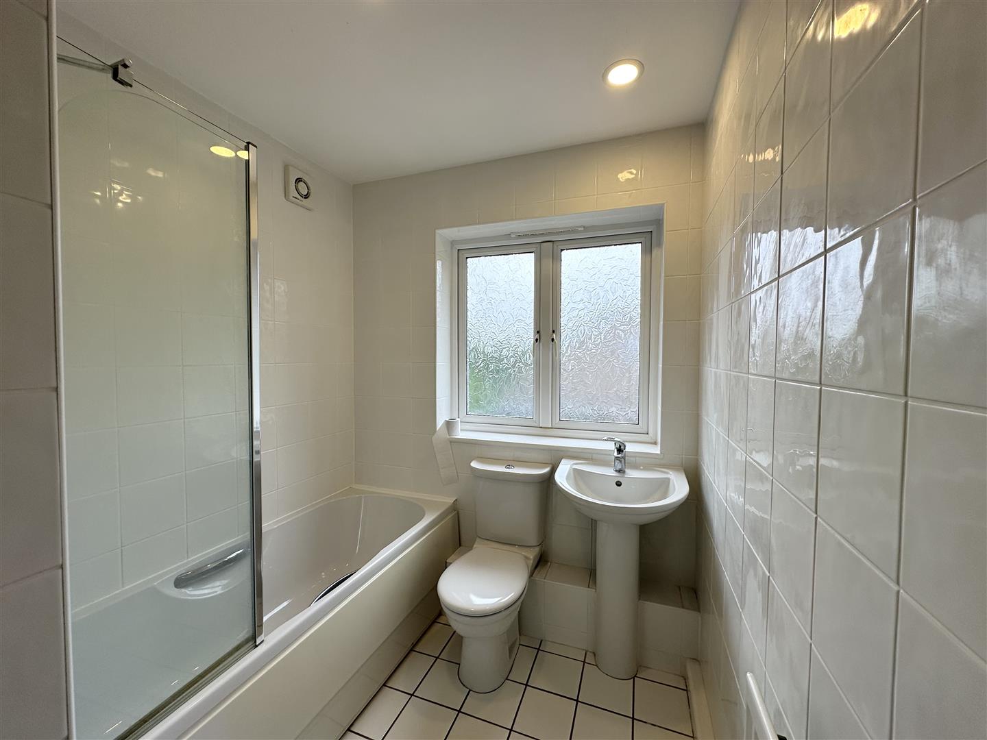 White suite comprising of panel enclosed bath with mixer tap and shower attachment, low level w.c, pedestal wash hand basin, tiled walls and flooring, radiator, uPVC window to rear.