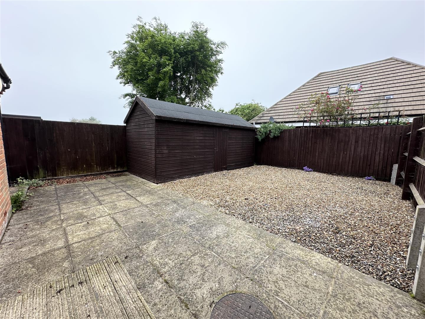 A low maintenance, fully enclosed garden with paved patio area, rest laid to decorative stone, workshop/shed.