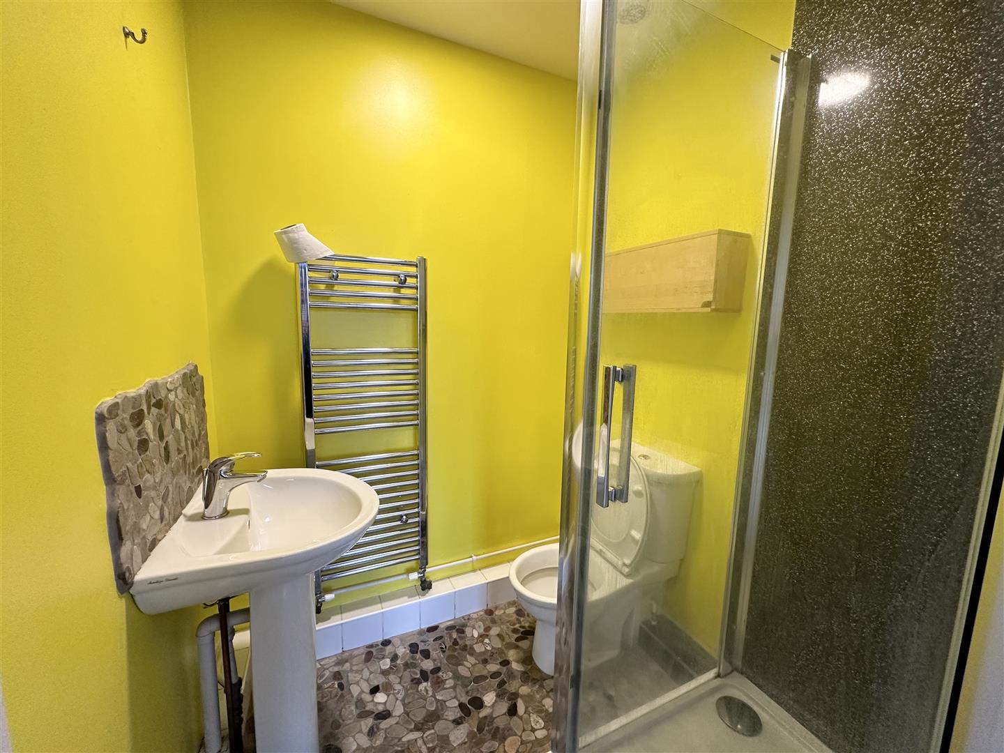 White suite comprising of fully tiled shower cubicle with wall mounted shower, low level w.c, wash hand basin, heated towel rail, tiled floor.