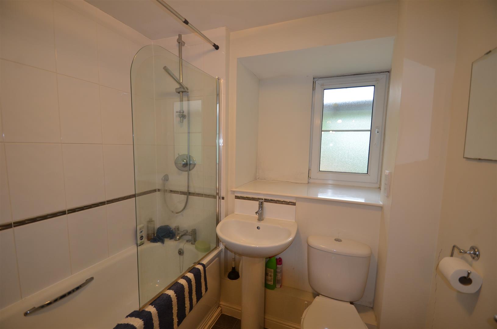 White suite comprising of panelled bath with wall mounted shower, glass shower screen, pedestal wash hand basin, low level w.c, part tiled walls, radiator, extractor fan, uPVC double glazed window to rear.