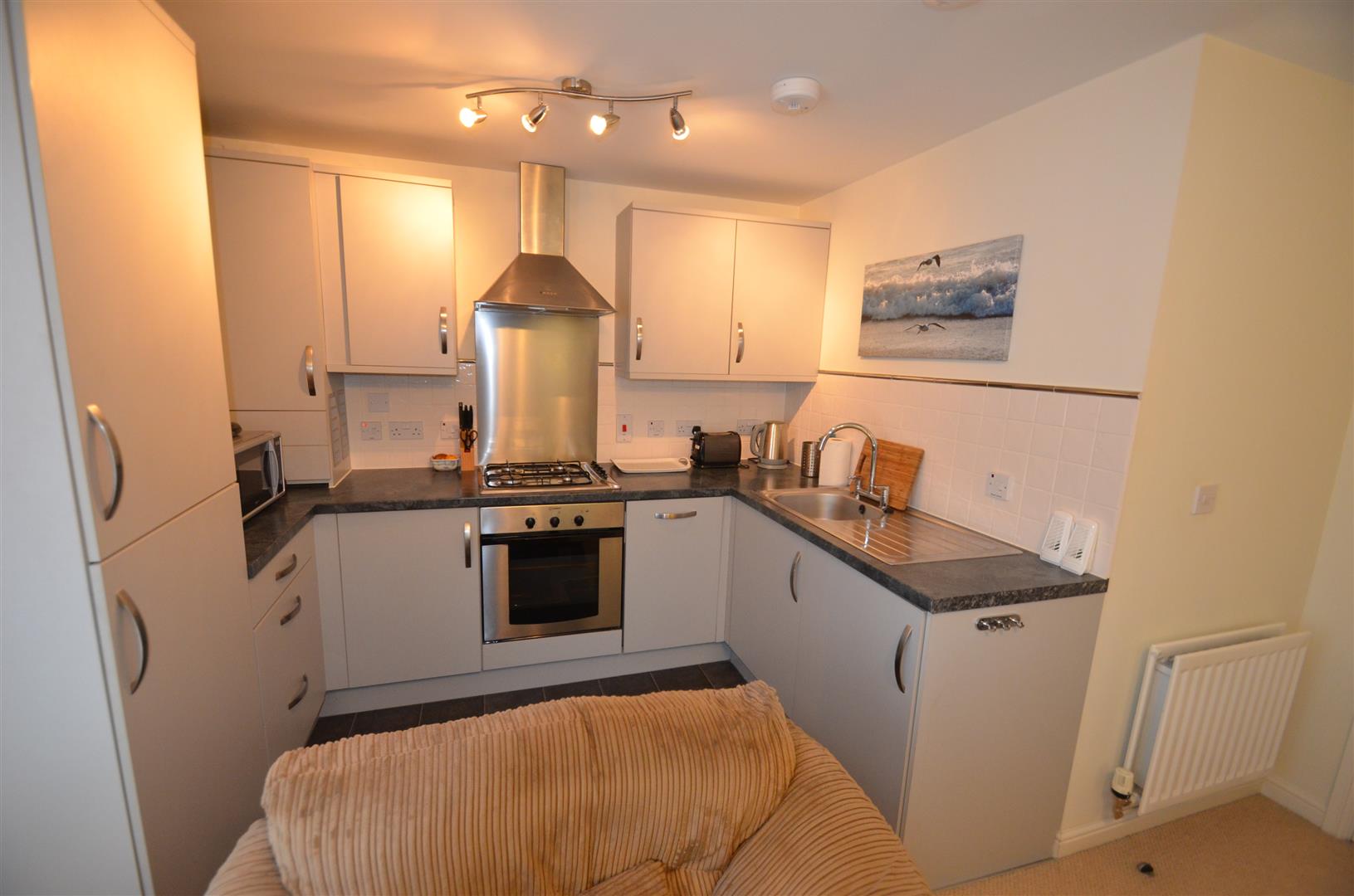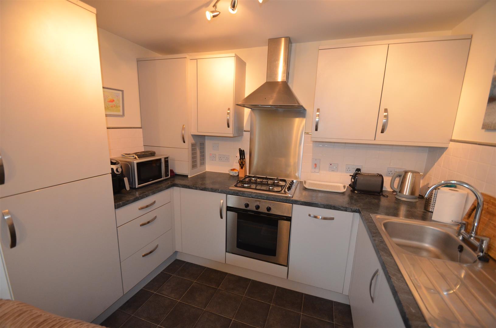 Range of base and eye level units with roll top work surfaces, stainless steel sink with mixer tap, tiled splash back, built in oven and hob with extractor hood over, integrated fridge/freezer, integrated dishwasher and washer/dryer.