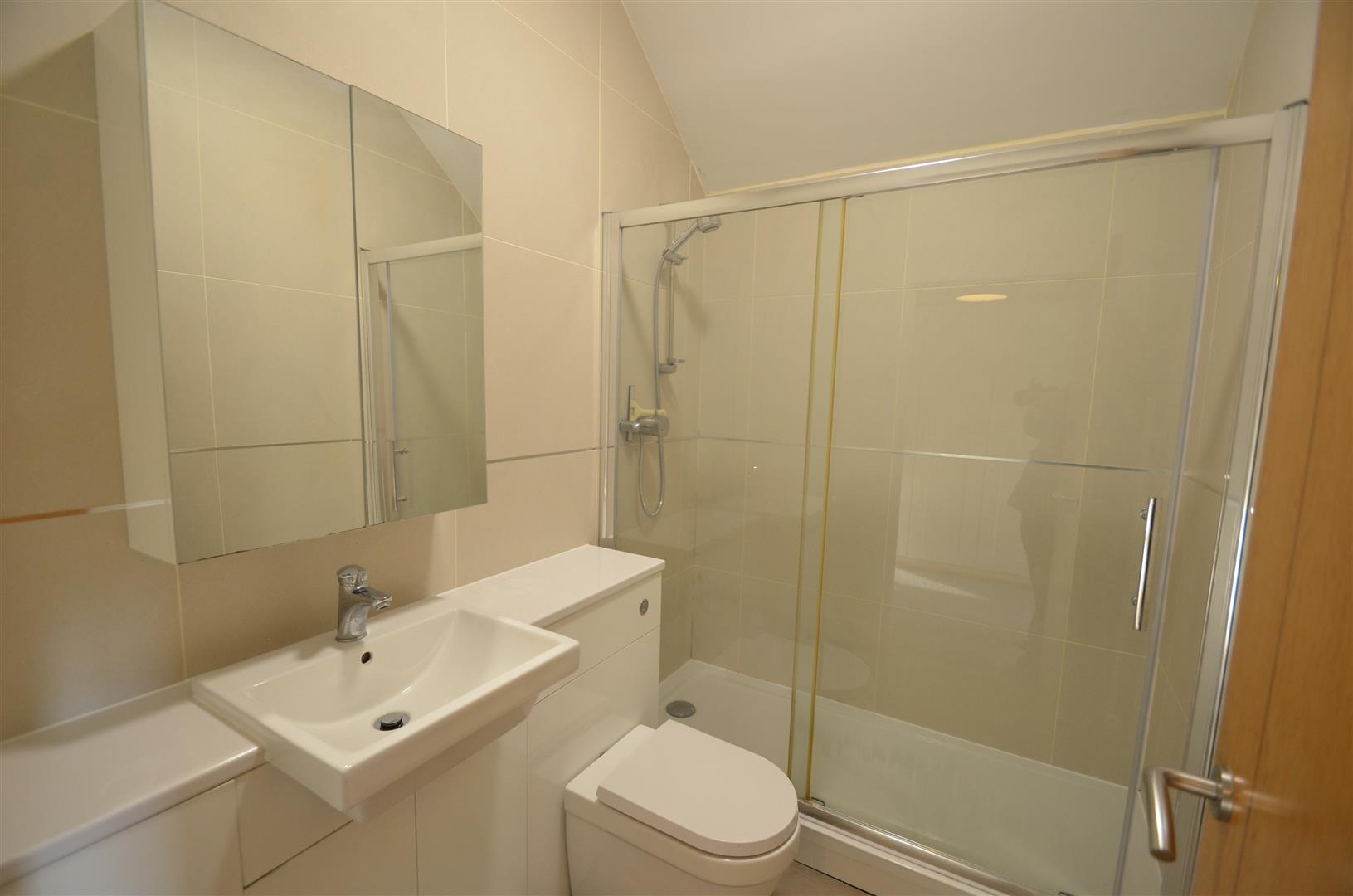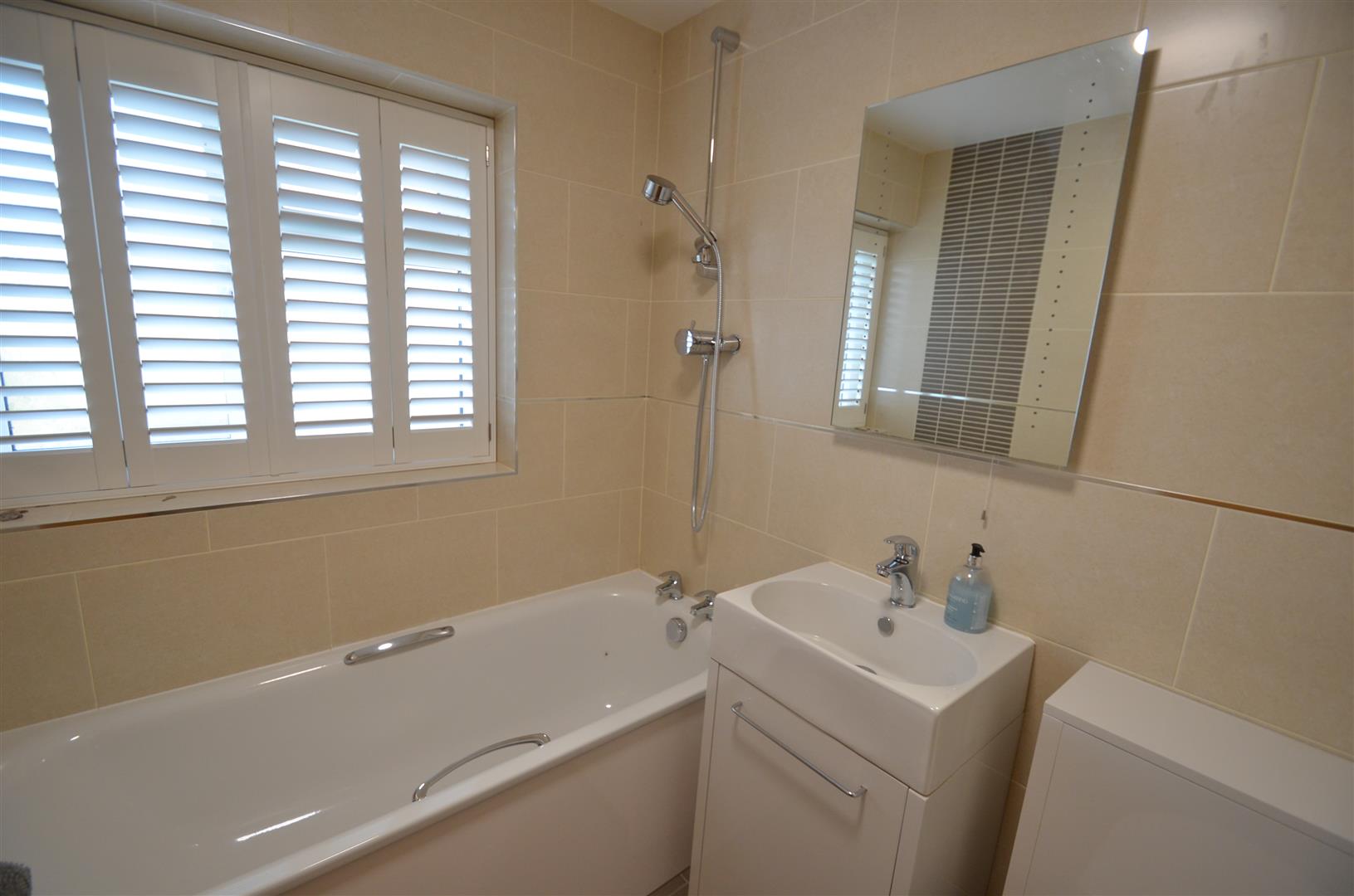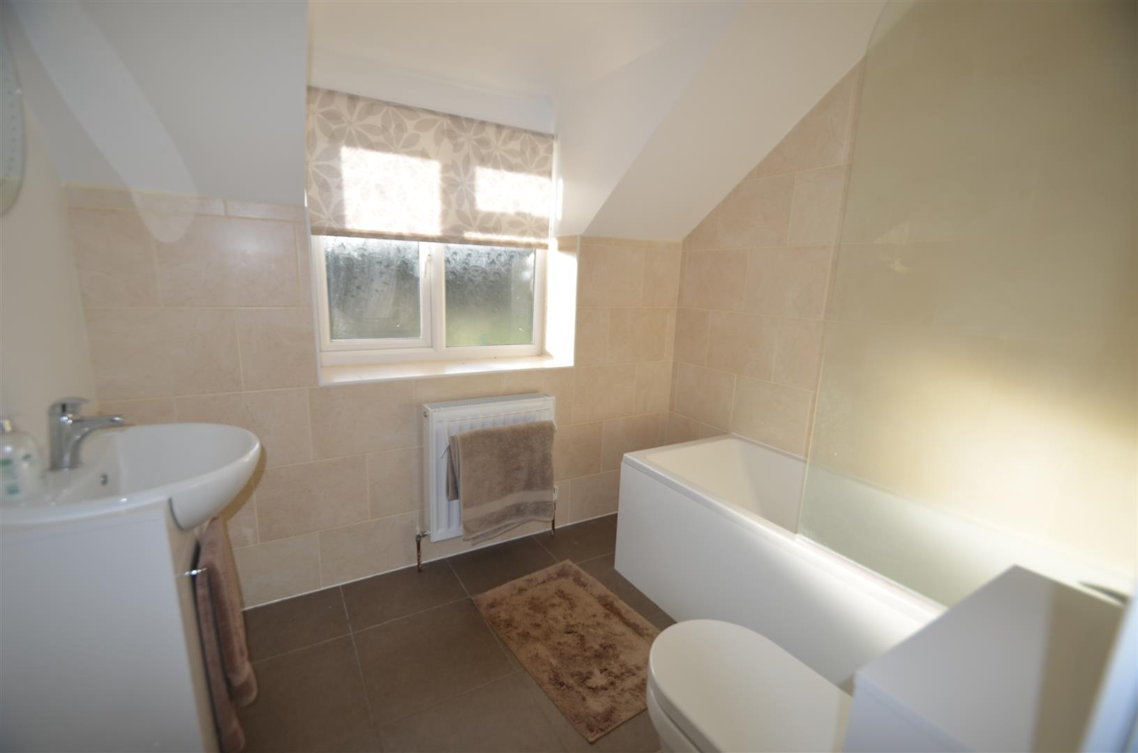 White suite comprising of panel enclosed bath, glass shower screen, low level w.c, wash hand basin in vanity unit, tiled floor, tiled walls, radiator, window to rear.
