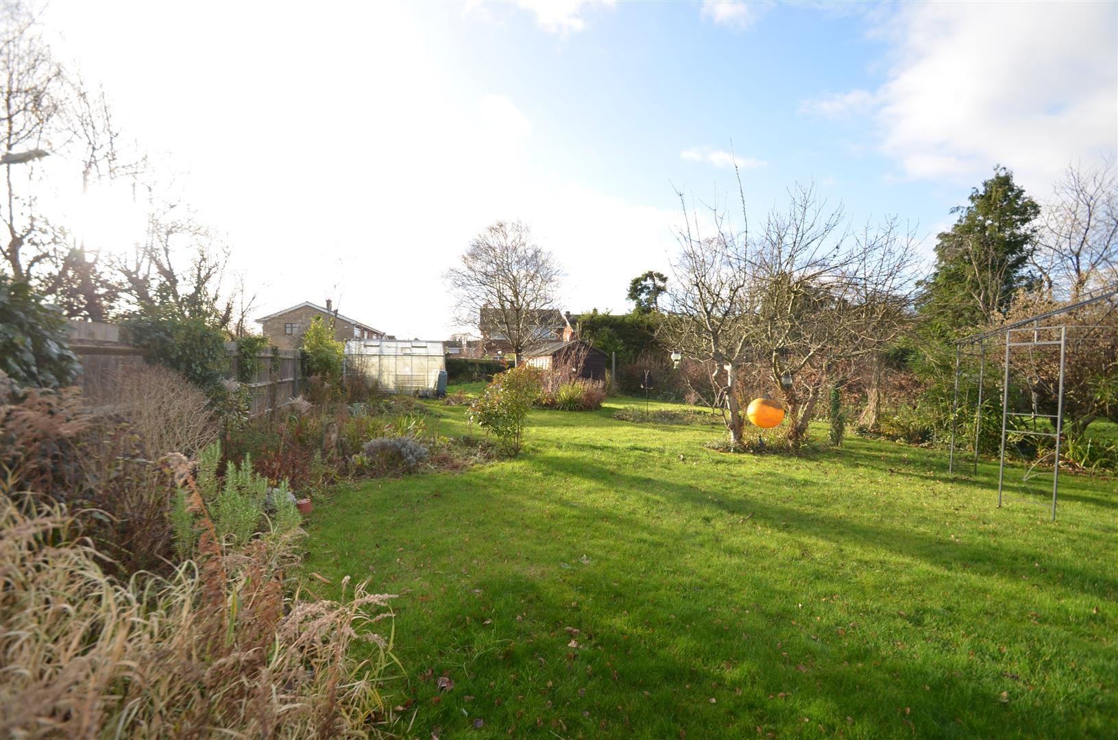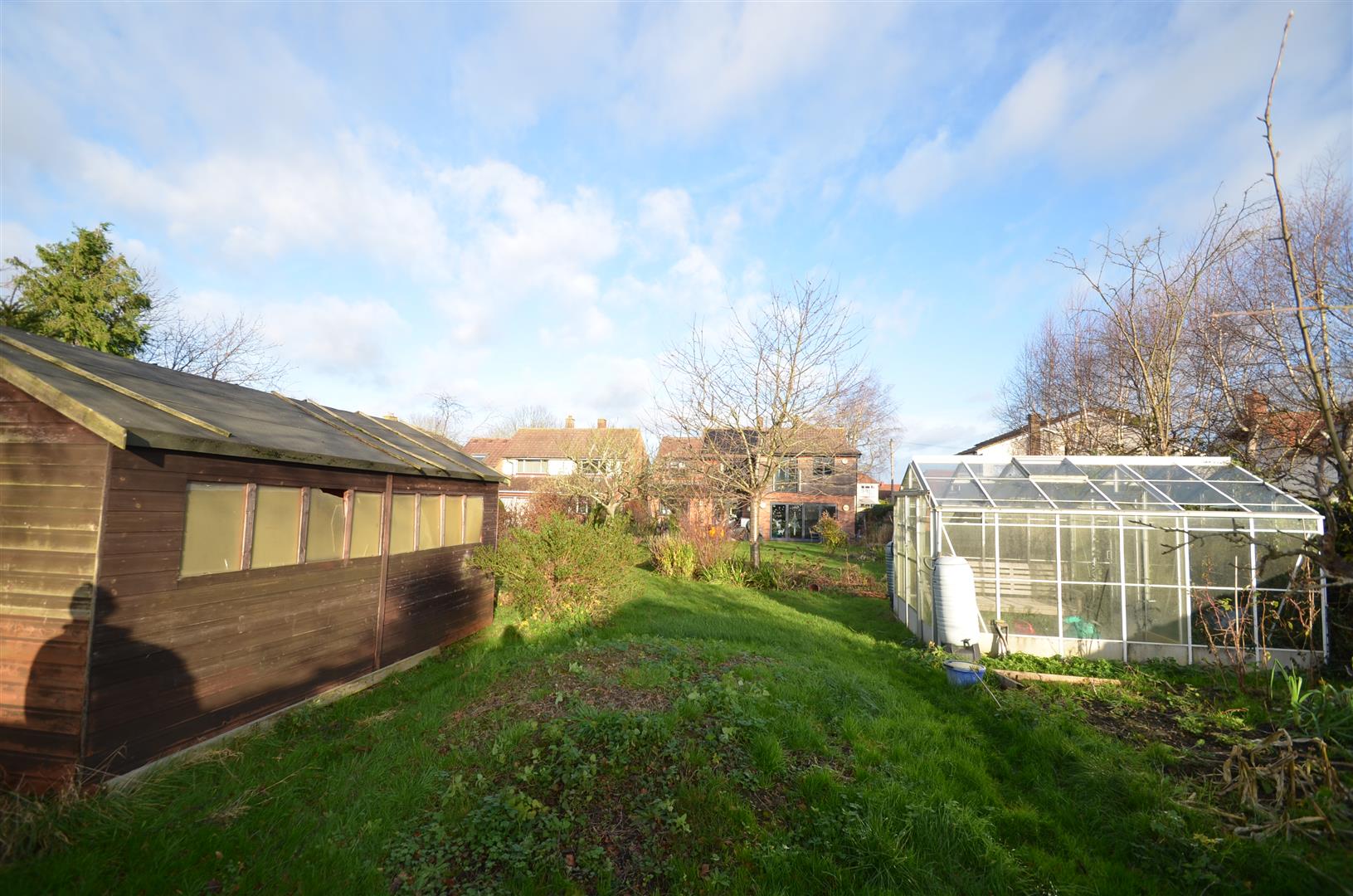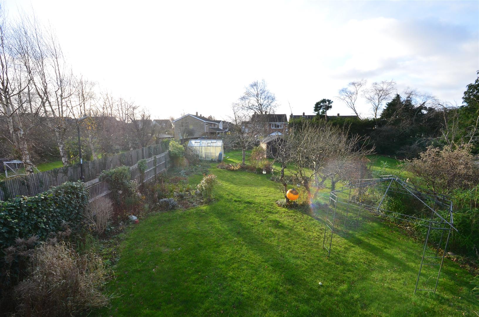 A large, fully enclosed garden approximately 130ft in length. Spacious decked area leading onto lawn with a selection of mature trees and shrubs, garden shed, greenhouse, gated access to front.