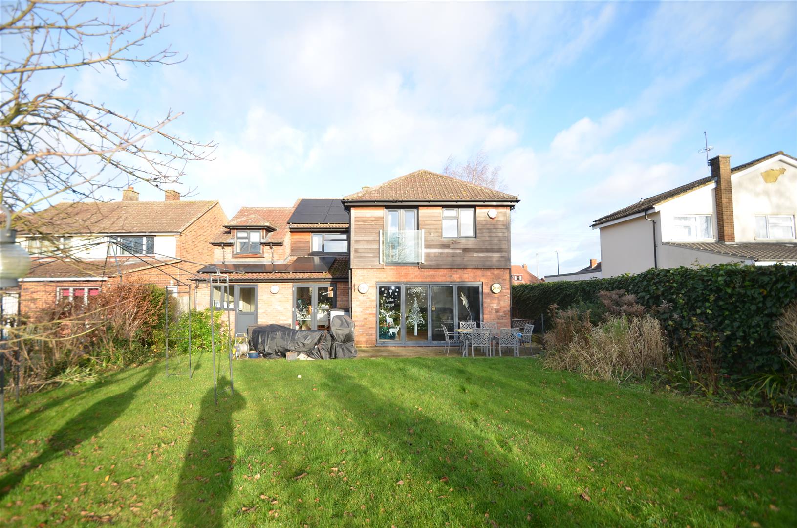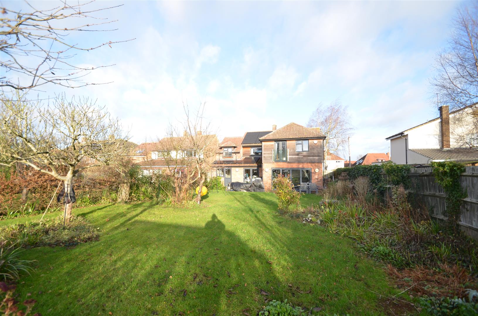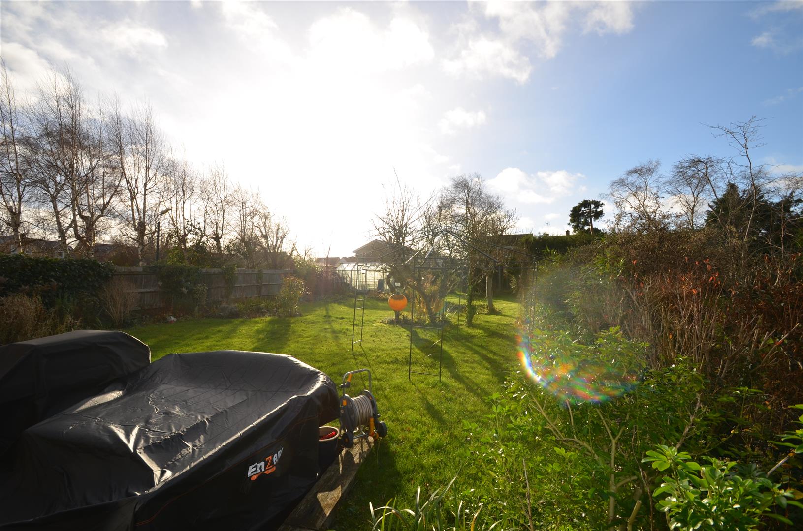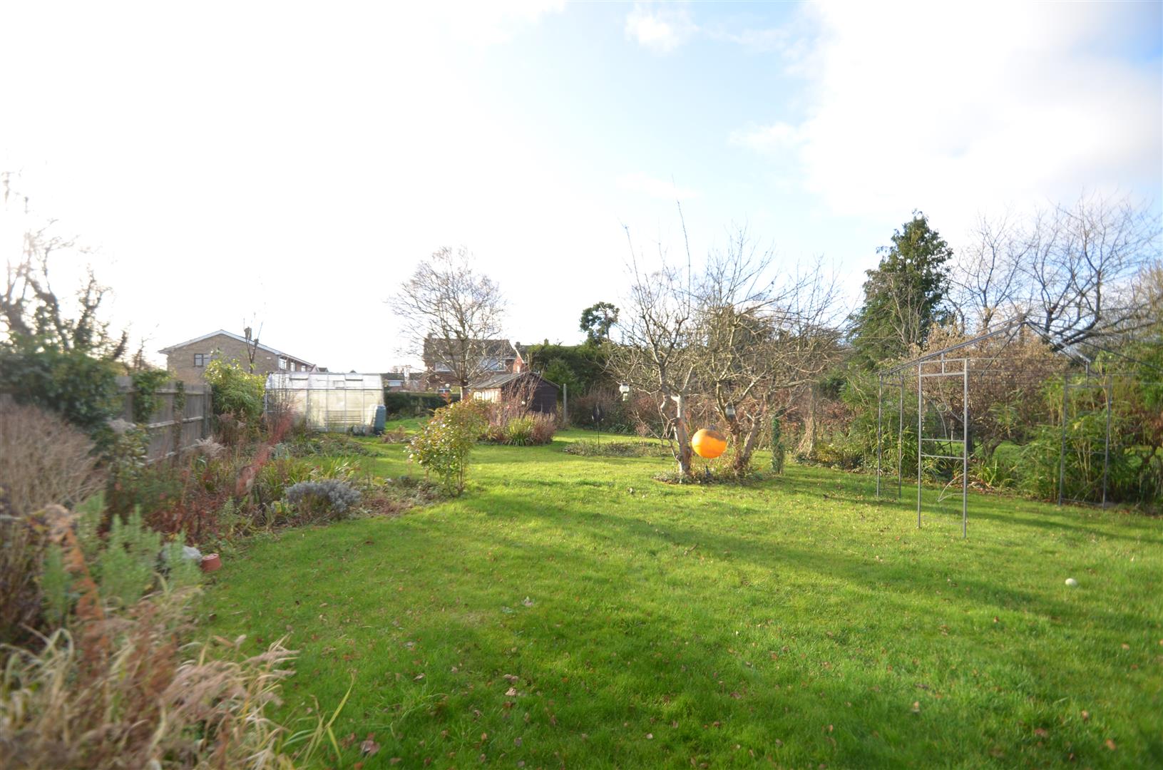 A large, fully enclosed garden approximately 130ft in length. Spacious decked area leading onto lawn with a selection of mature trees and shrubs, garden shed, greenhouse, gated access to front.
