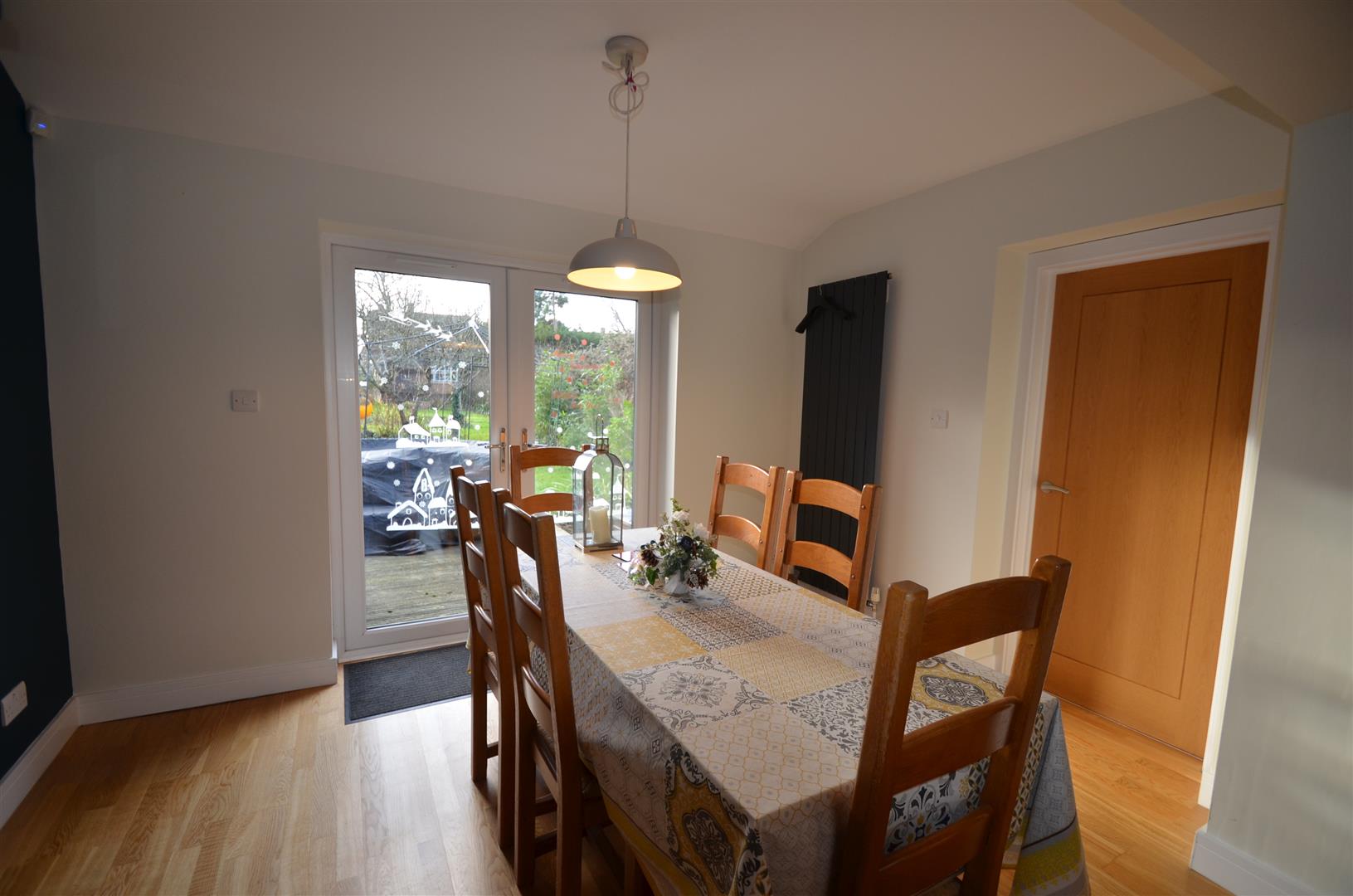 French doors to garden, radiator, wood flooring.