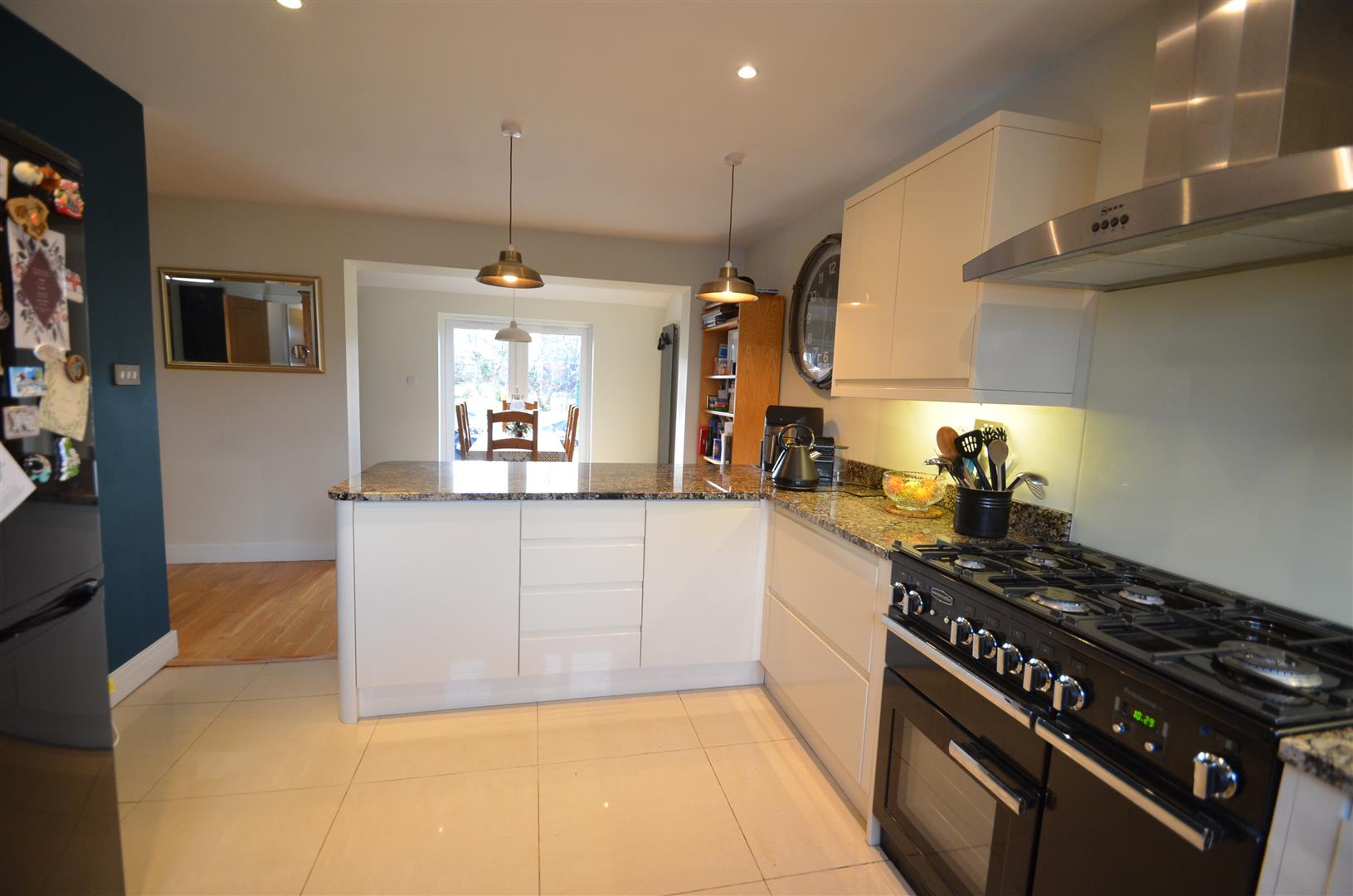 A well fitted kitchen with a range of base and eye level units with granite top work surfaces, inset sink unit with mixer tap, Freestanding range cooker, integrated combi microwave, integrated fridge and dishwasher, inset spotlights, tiled floor, window t