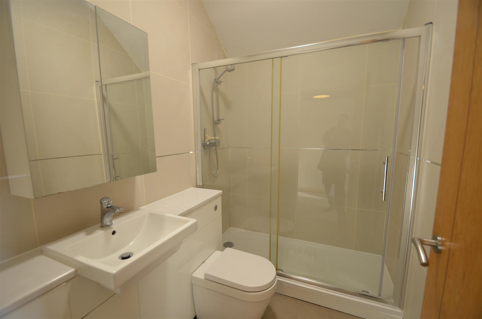 White suite comprising of large walk in shower enclosure, low level w.c and wash hand basin in vanity unit, tiled walls, tiled floor, heated towel rail.