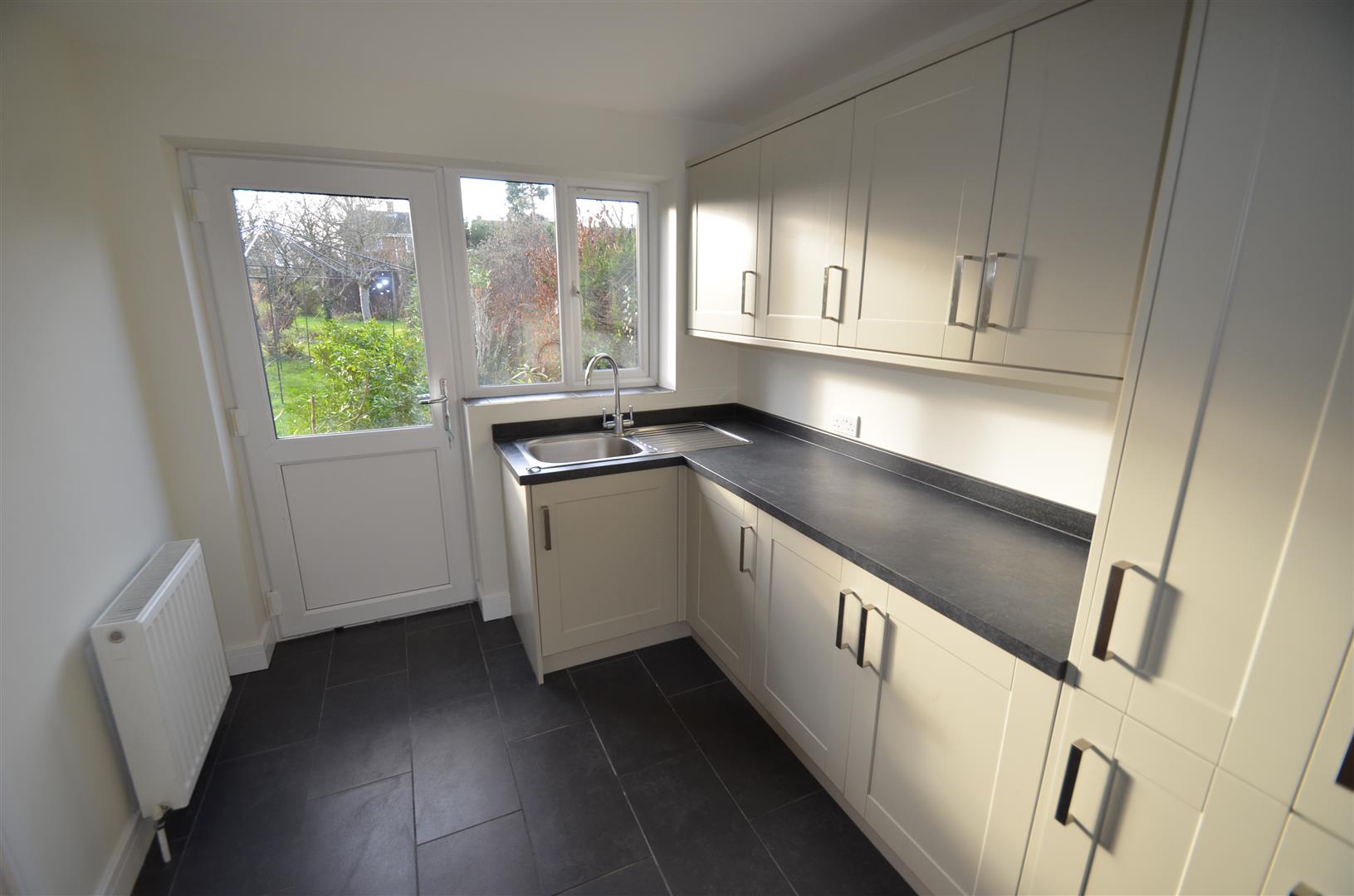 Well fitted with a range of base and eye level units with roll top work surfaces, inset stainless steel sink unit with mixer tap, tiled floor, window and door to rear garden, personal door to garage.