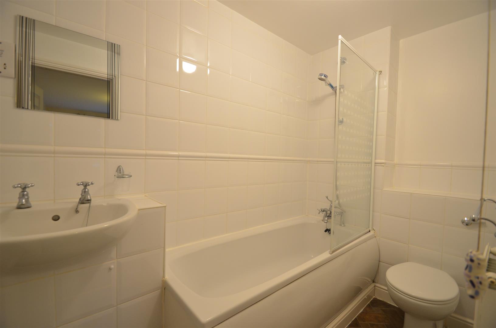 Suite comprising of panel enclosed bath with mixer tap and wall mounted shower attachment, glass shower screen, low level w.c, wash hand basin, radiator, extractor fan.