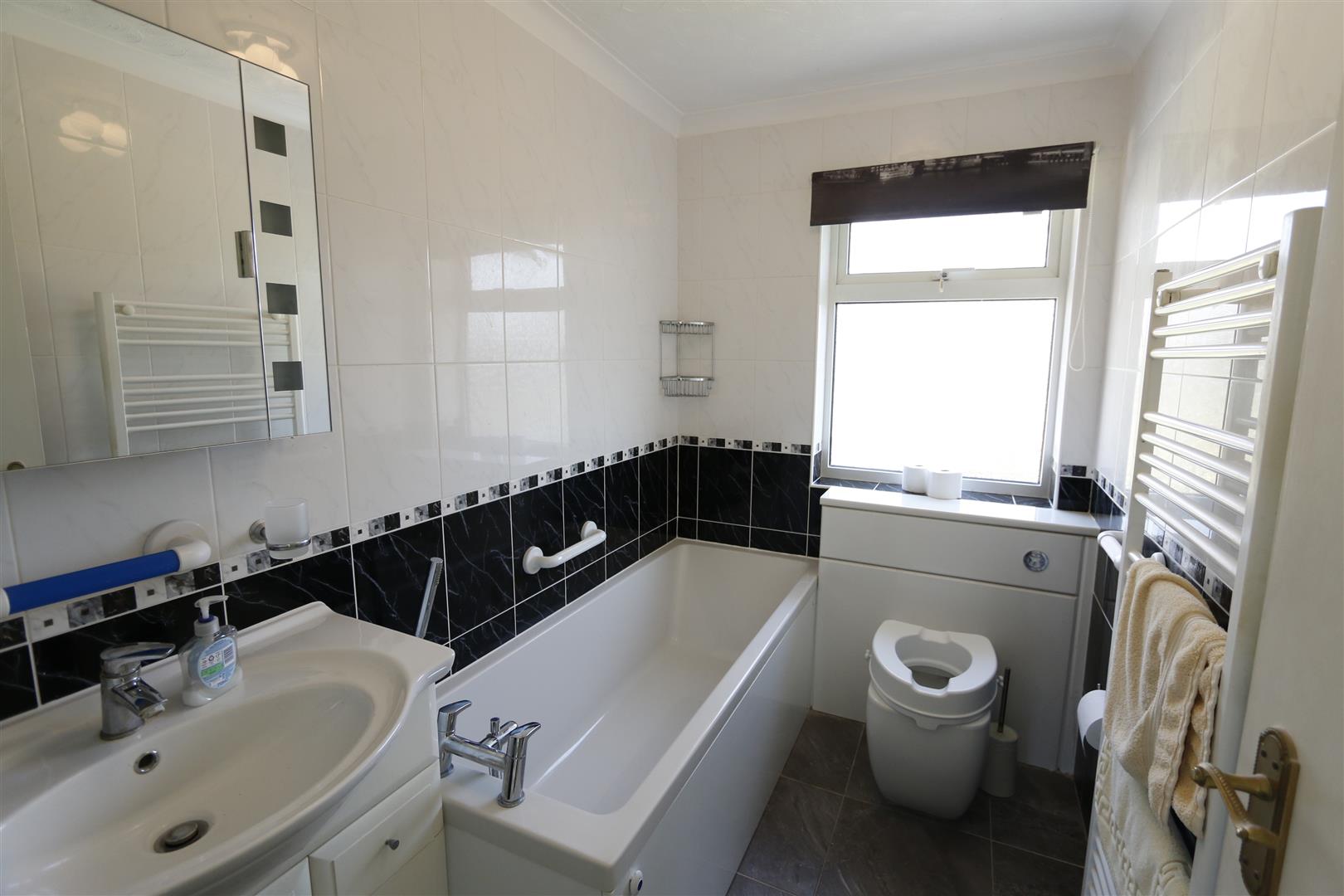 White suite comprising of panel enclosed bath with mixer tap, wash hand basin in vanity unit, low level w.c, tiled floor, tiled walls, heated towel rail, window to rear.