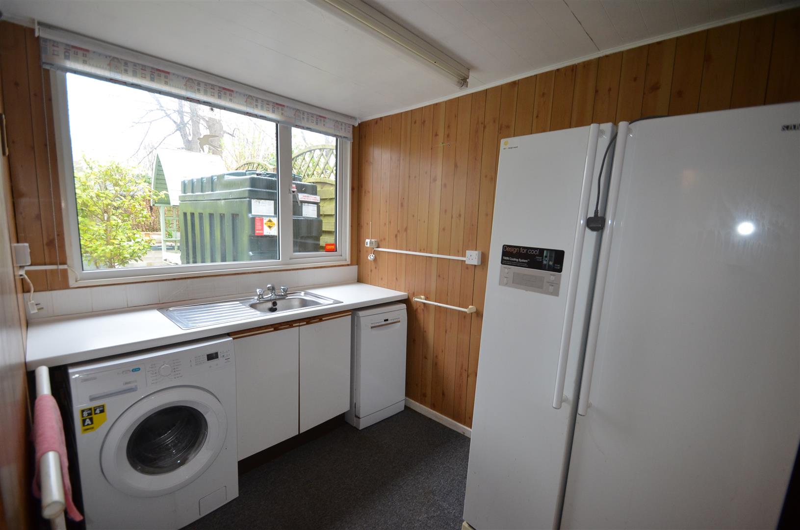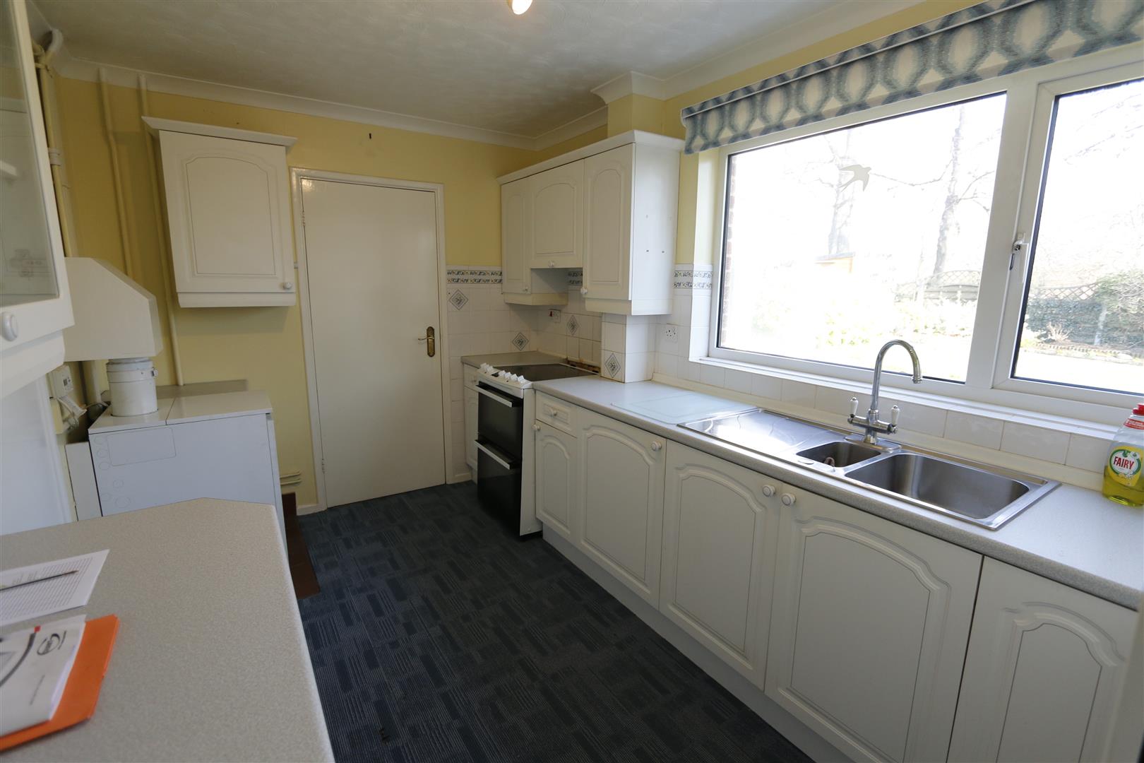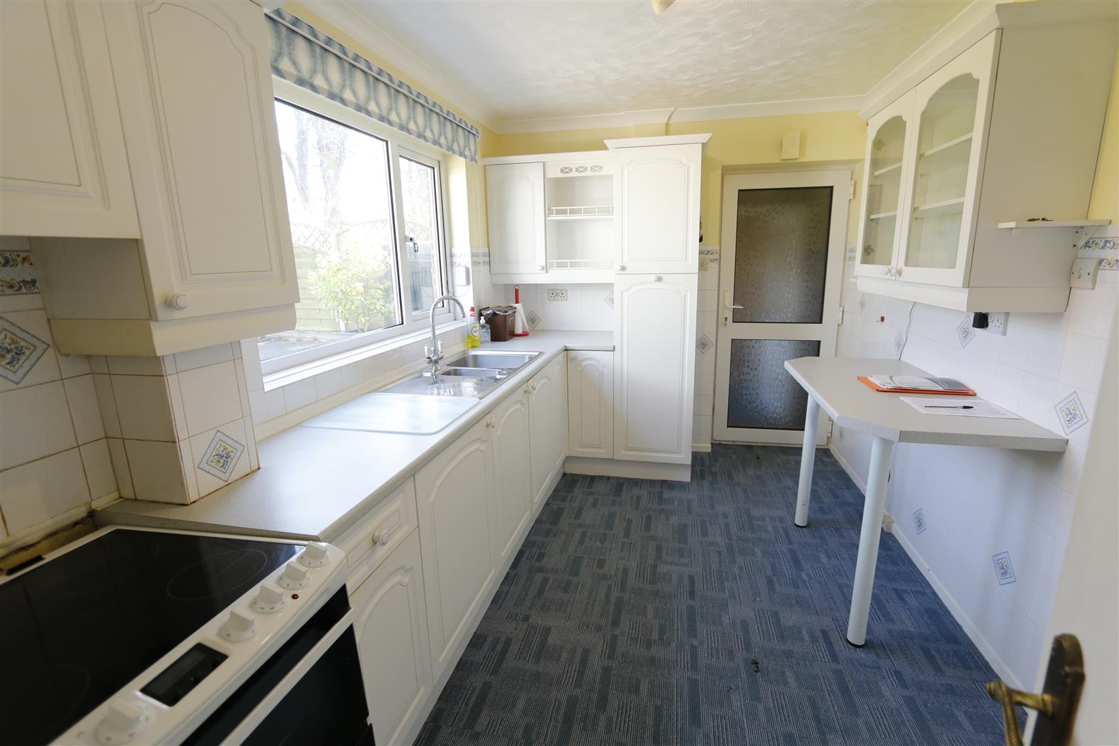Fitted kitchen with a range of base and eye level units with roll top work surfaces, one and a half stainless steel sink unit with mixer tap, tiled splash back, electric cooker point, part tiled walls, floor standing oil fired boiler, window to rear.