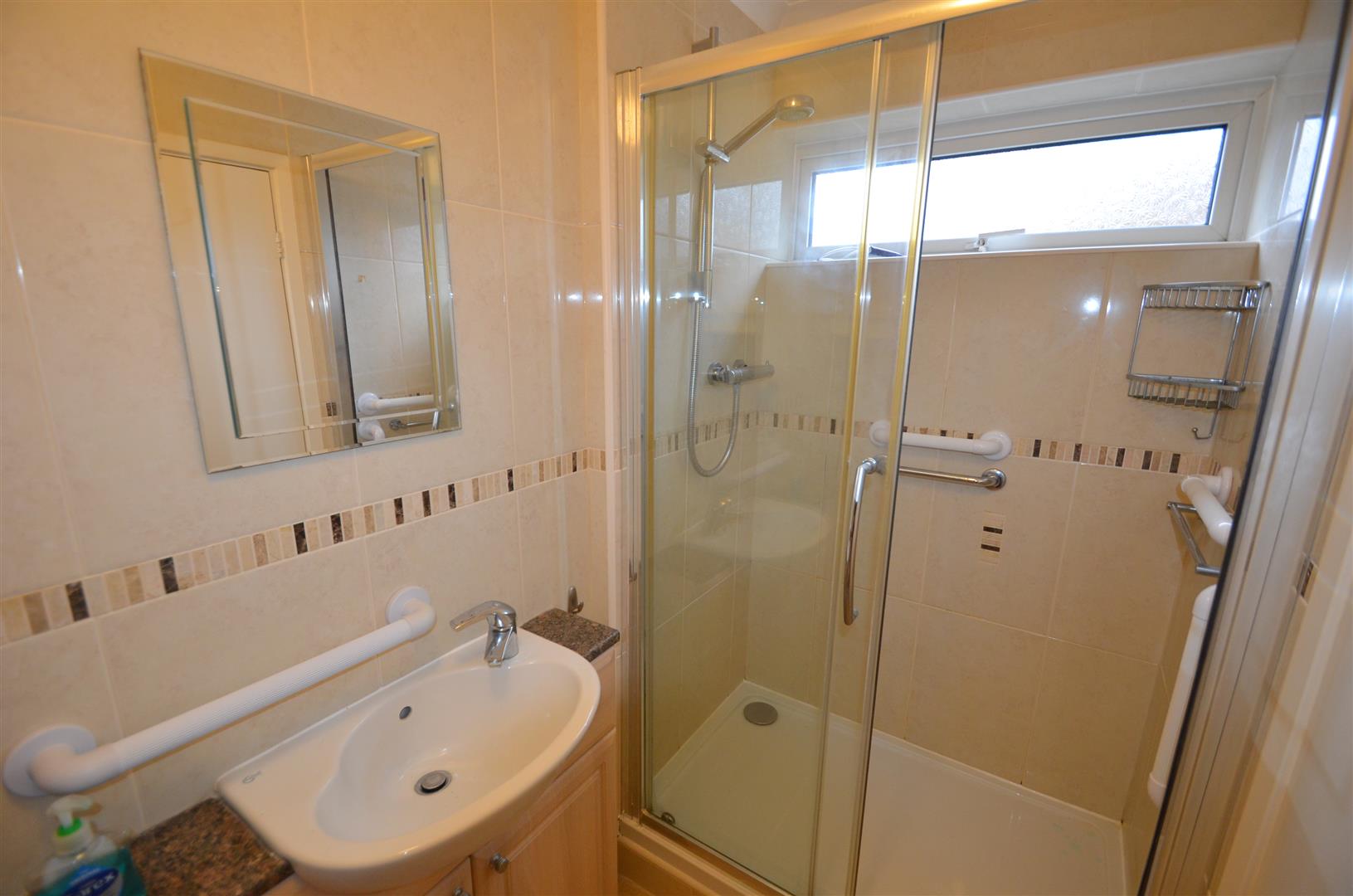 White suite comprising of fully tiled shower cubicle with wall mounted shower, low level w.c, wash hand basin in vanity unit, fully tiled walls, heated towel rail, tiled floor, window to front.