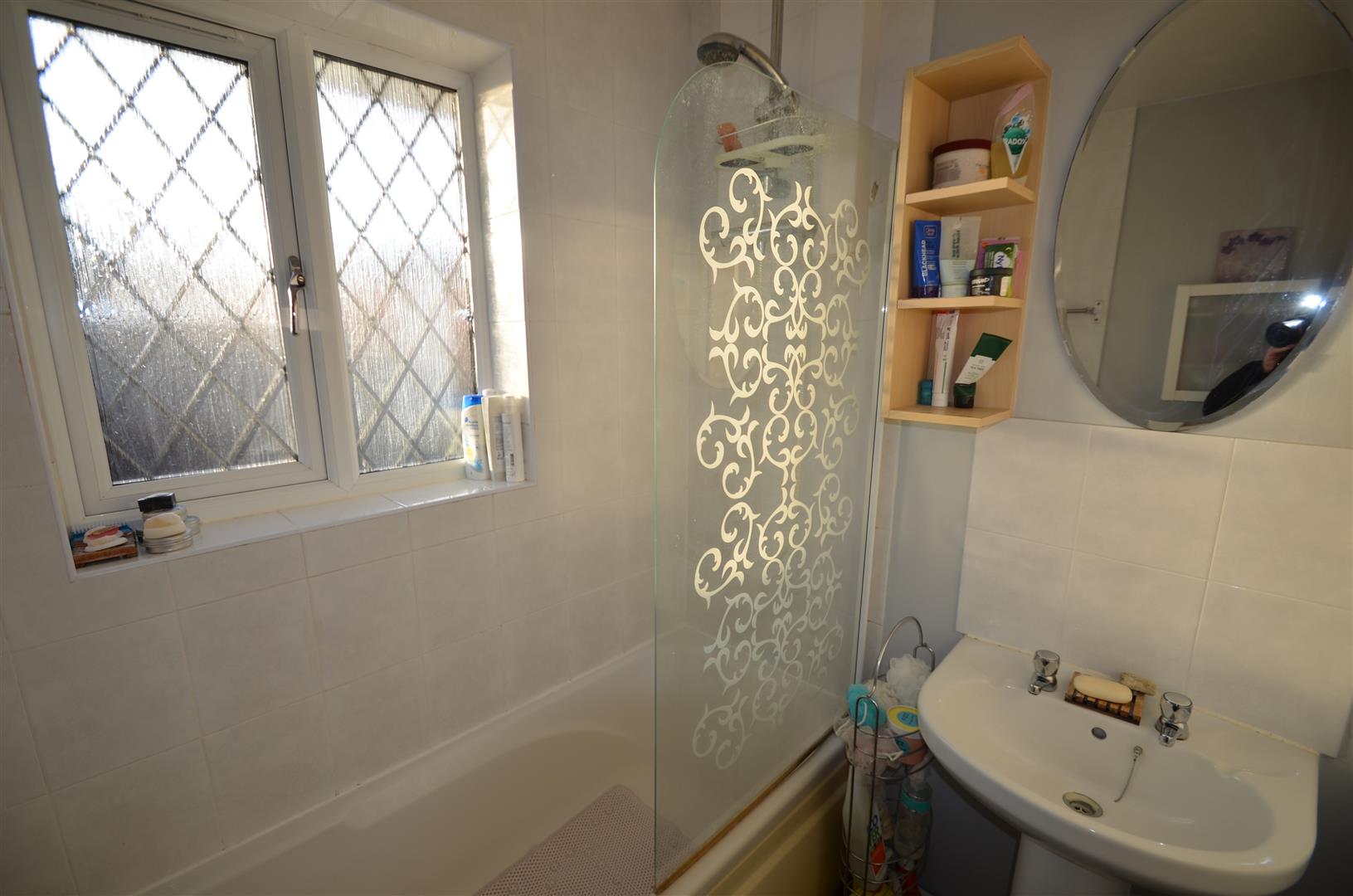 White suite comprising of panel enclosed bath, wall mounted electric shower, glass shower screen, low level w.c, pedestal wash hand basin, fully tiled walls, radiator, window to front.