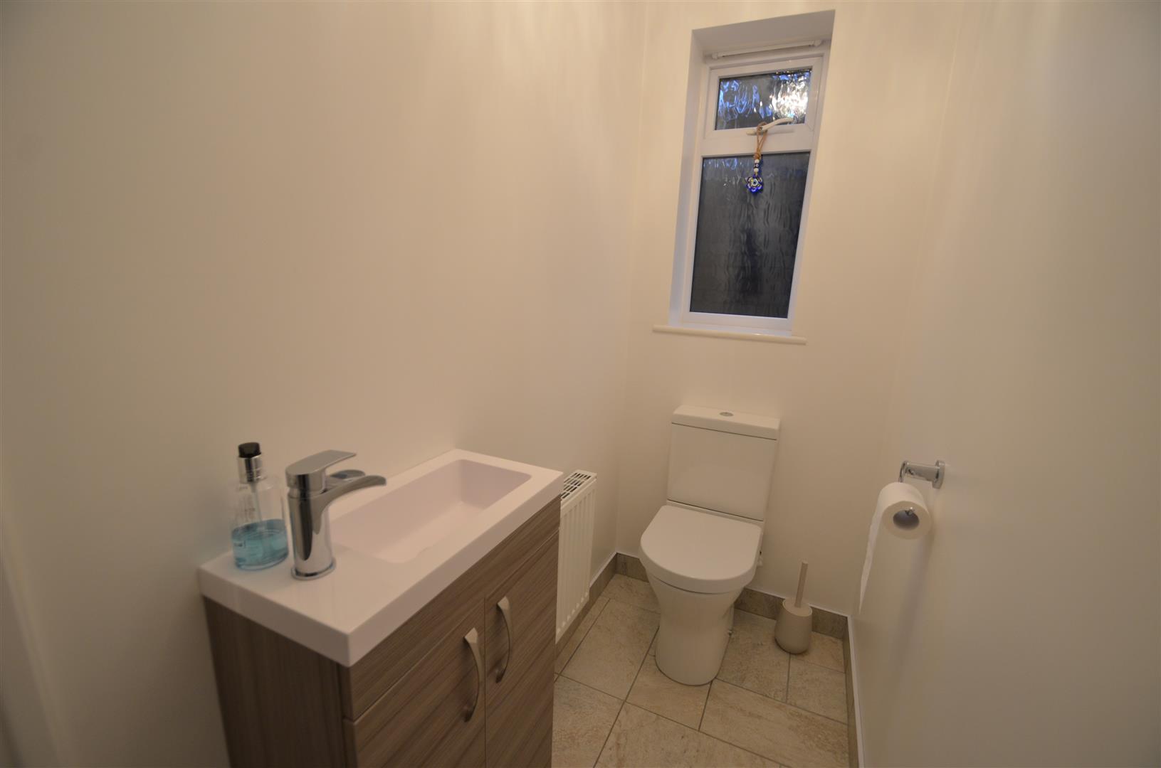 White suite comprising of low level w.c, wash hand basin in vanity unit, radiator, window to side, tiled floor.