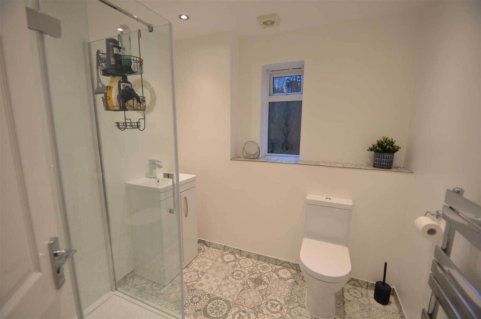 White suite comprising of fully tiled shower cubicle with wall mounted shower, wash hand basin in vanity unit, low level w.c, tiled floor, inset spotlights, heated towel rail, window to side.