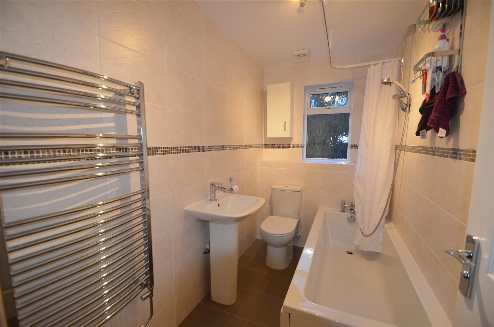 White suite comprising of panel enclosed bath with mixer tap and wall mounted shower, low level w.c, pedestal wash hand basin, heated towel rail, window to side, tiled floor, tiled walls.