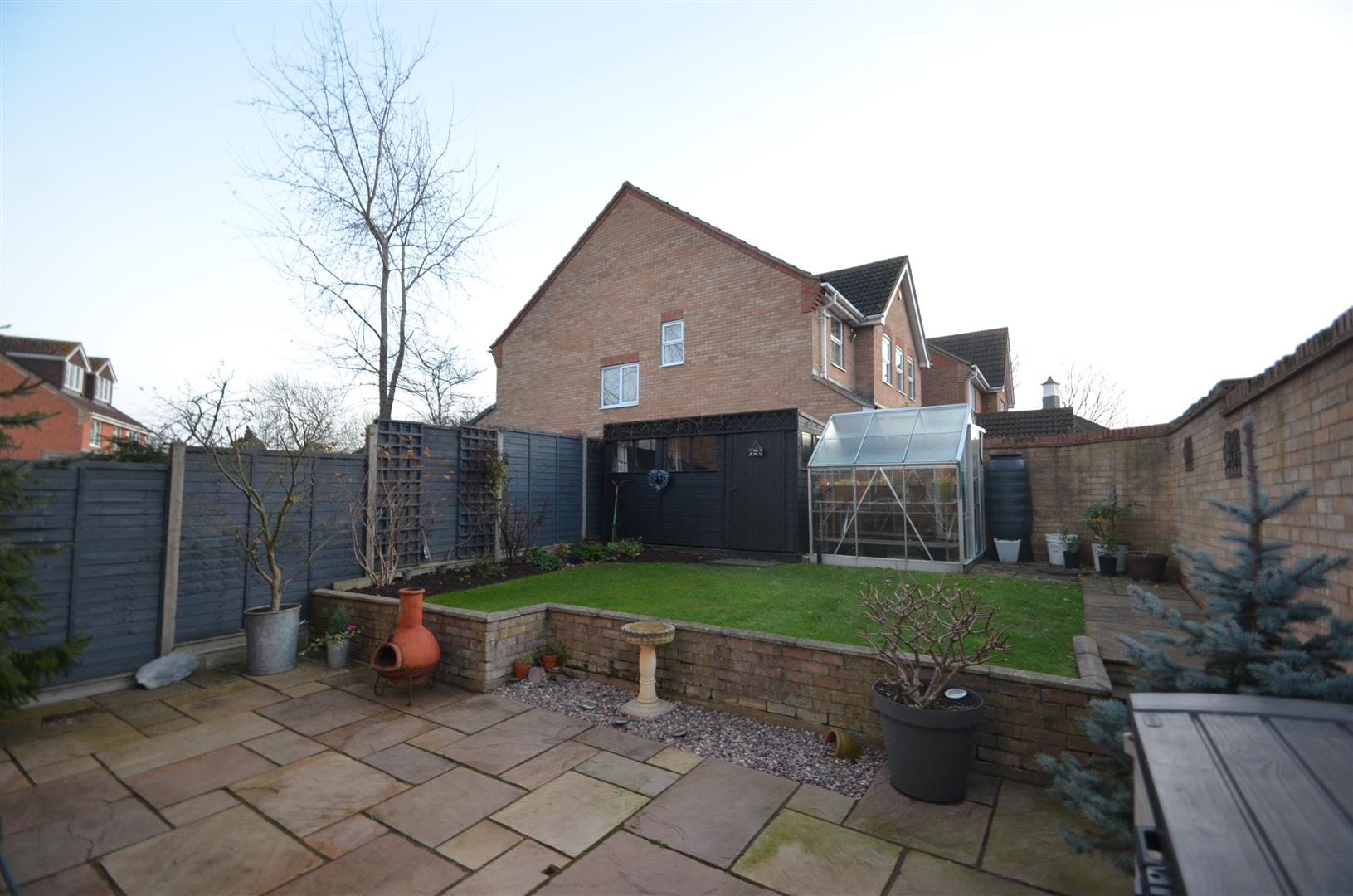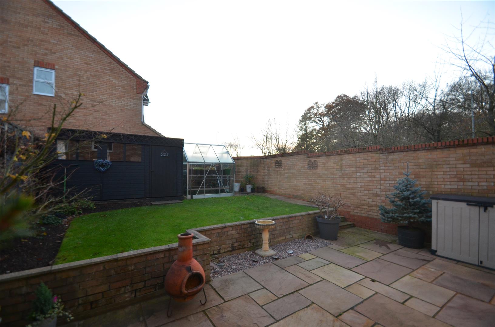 Large paved patio area, steps up to lawn area with flower bed border, garden shed, greenhouse, gated access to front.