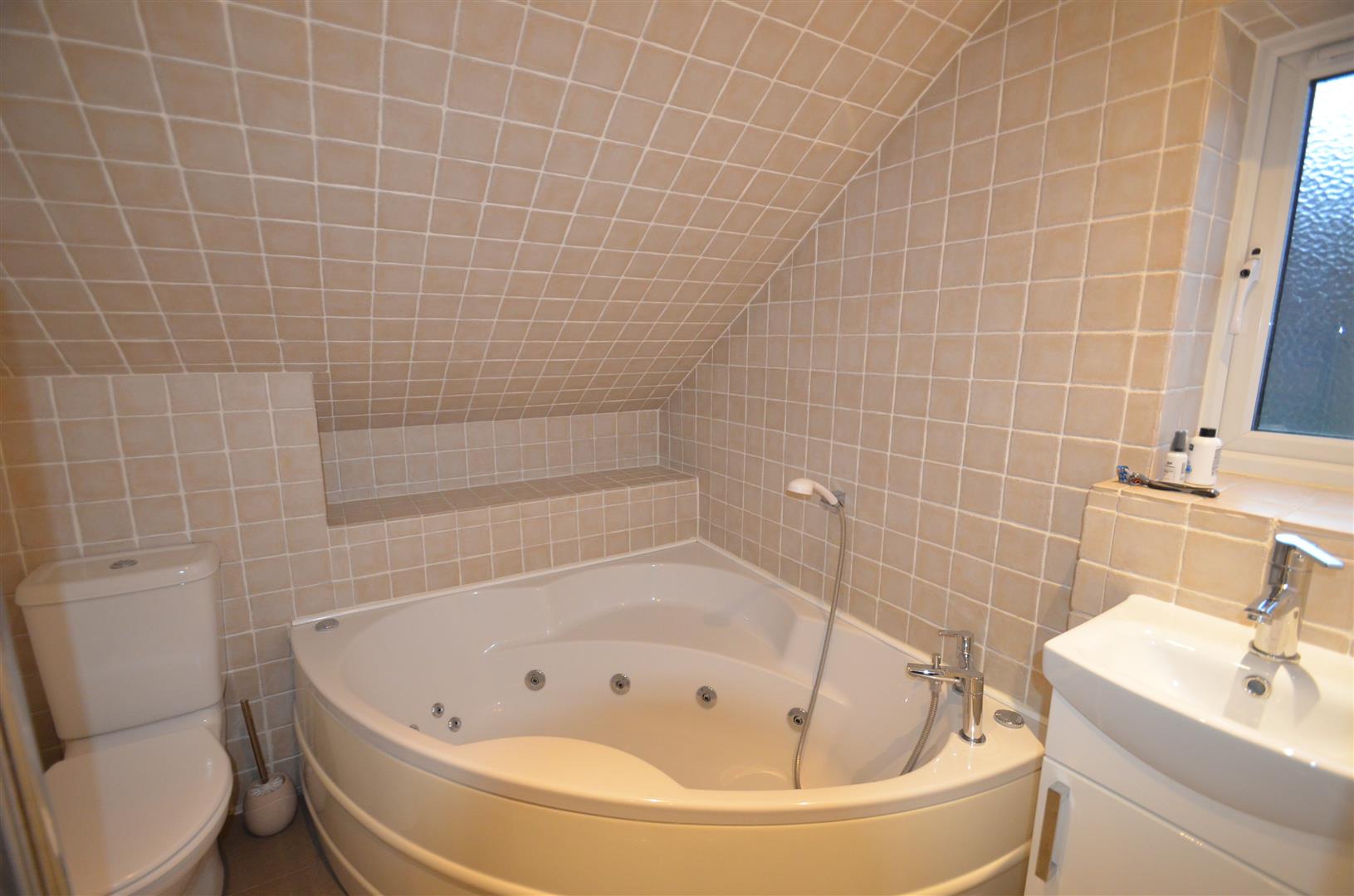 White suite comprising of corner jacuzzi bath with mixer tap, low level w.c, wash hand basin in vanity unit, tiled floor, tiled walls, window to rear.