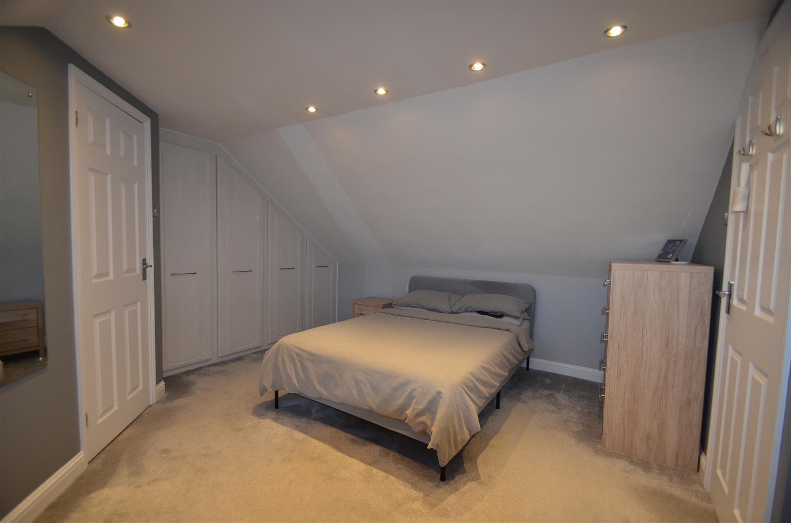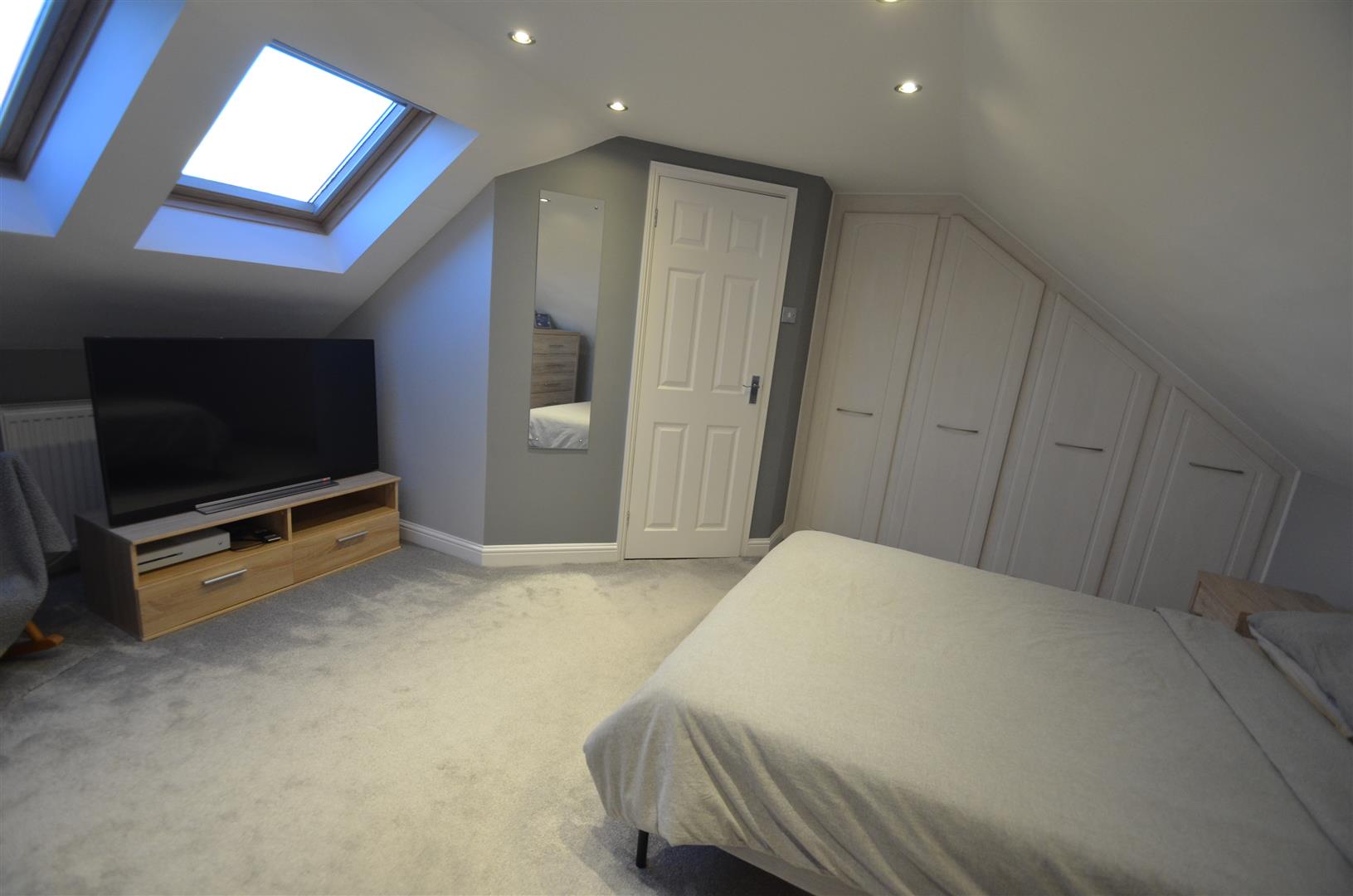 Spacious room with two velux windows to rear, range of fitted wardrobes, radiator, door to:-