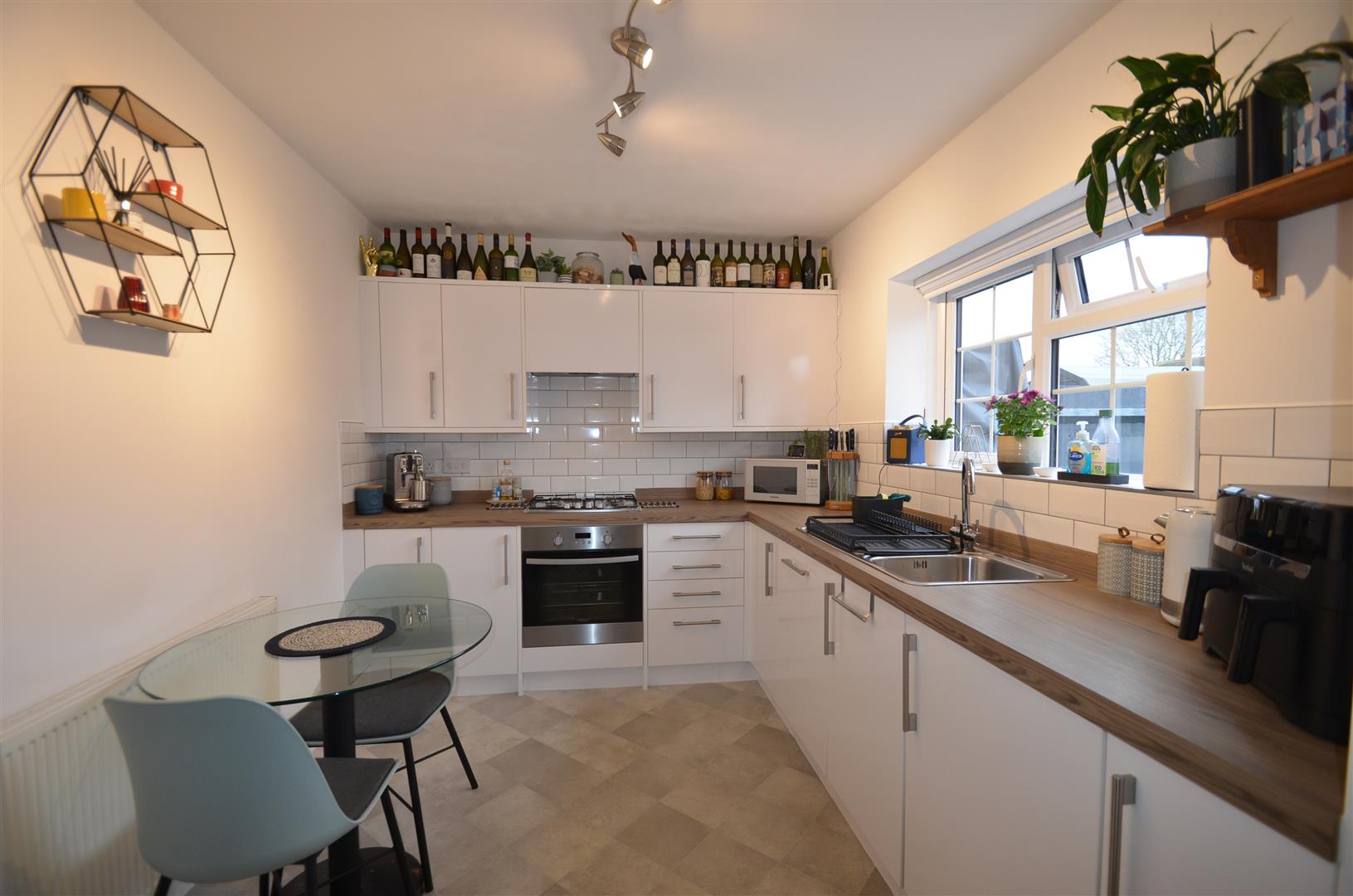A well fitted kitchen with a range of base eye and level units with roll top work surfaces, one and a half stainless steel sink unit with mixer tap, integrated appliances including electric oven, gas hob, dish washer, washing machine and tiled splash back