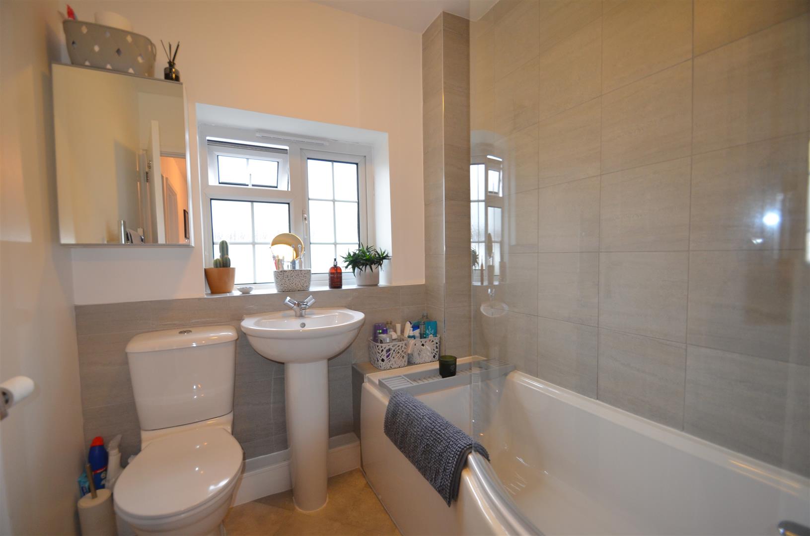 White suite comprising of panel enclosed bath with mixer tap and wall mounted shower, glass shower screen, low level w.c, pedestal wash hand basin, heated towel rail, part tiled walls, window to front.
