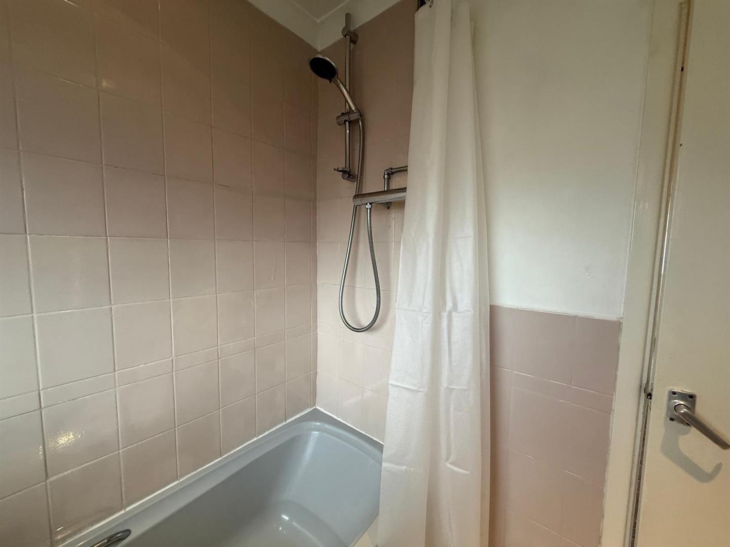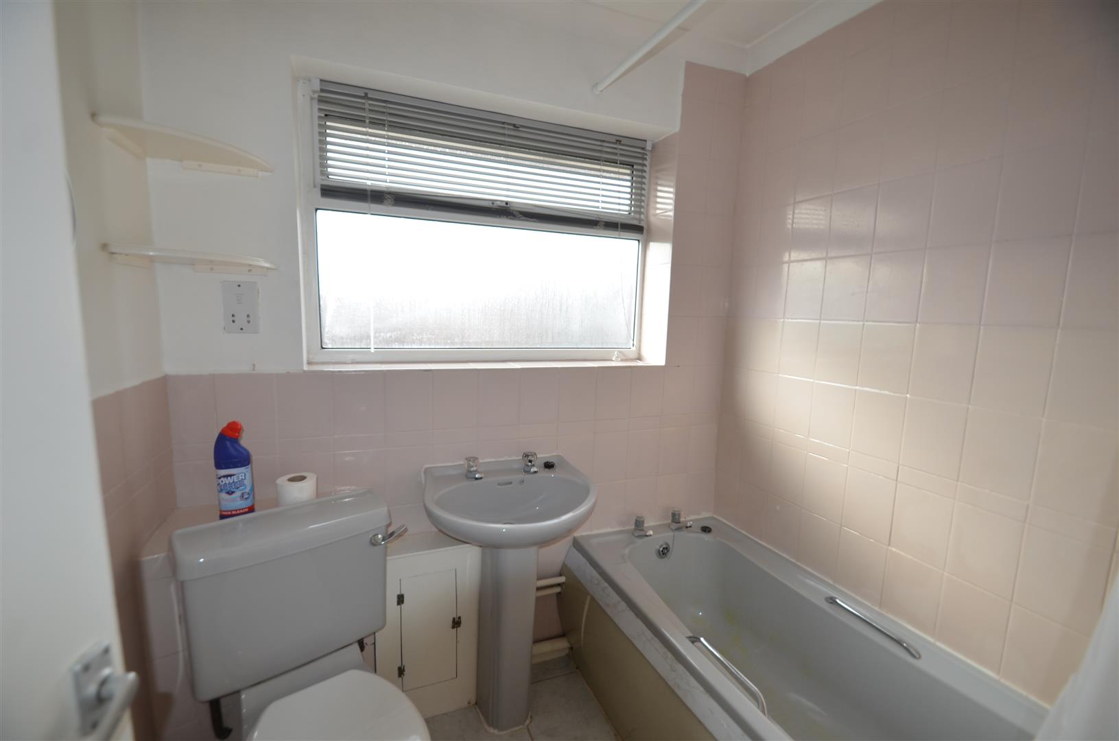 Suite comprising of panel enclosed bath, wall mounted shower, pedestal wash hand basin, low level w.c, heated towel rail, tiled walls, tiled floor, window to rear.