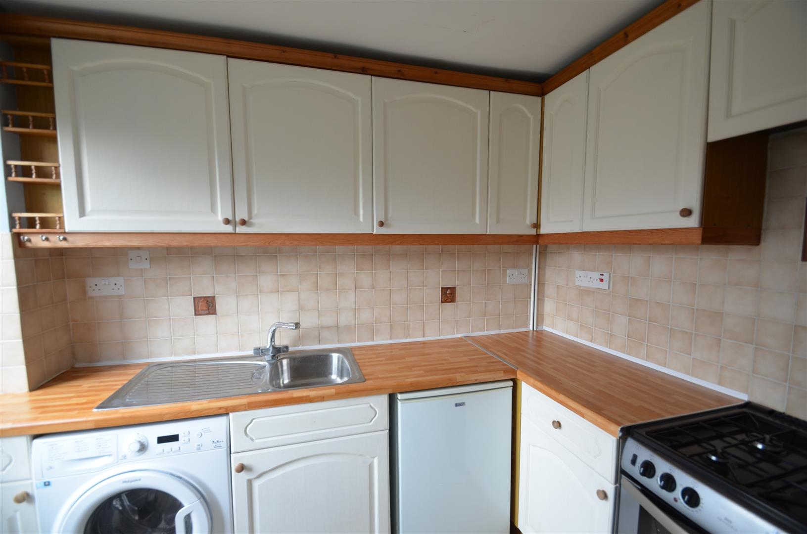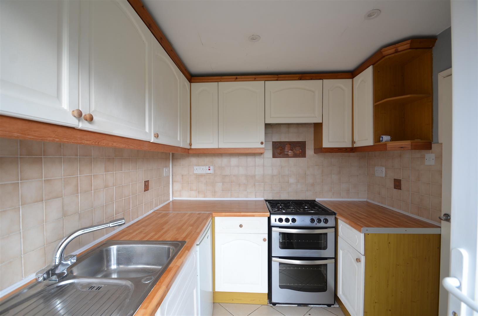 Fully fitted kitchen with a range of base and eye level units with roll top work surfaces, stainless steel sink unit with mixer tap, tiled splash back, tiled floor, plumbing for washing machine, built in cupboard, window and door to garden.