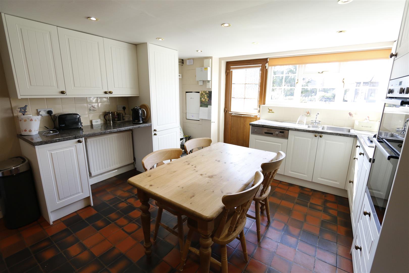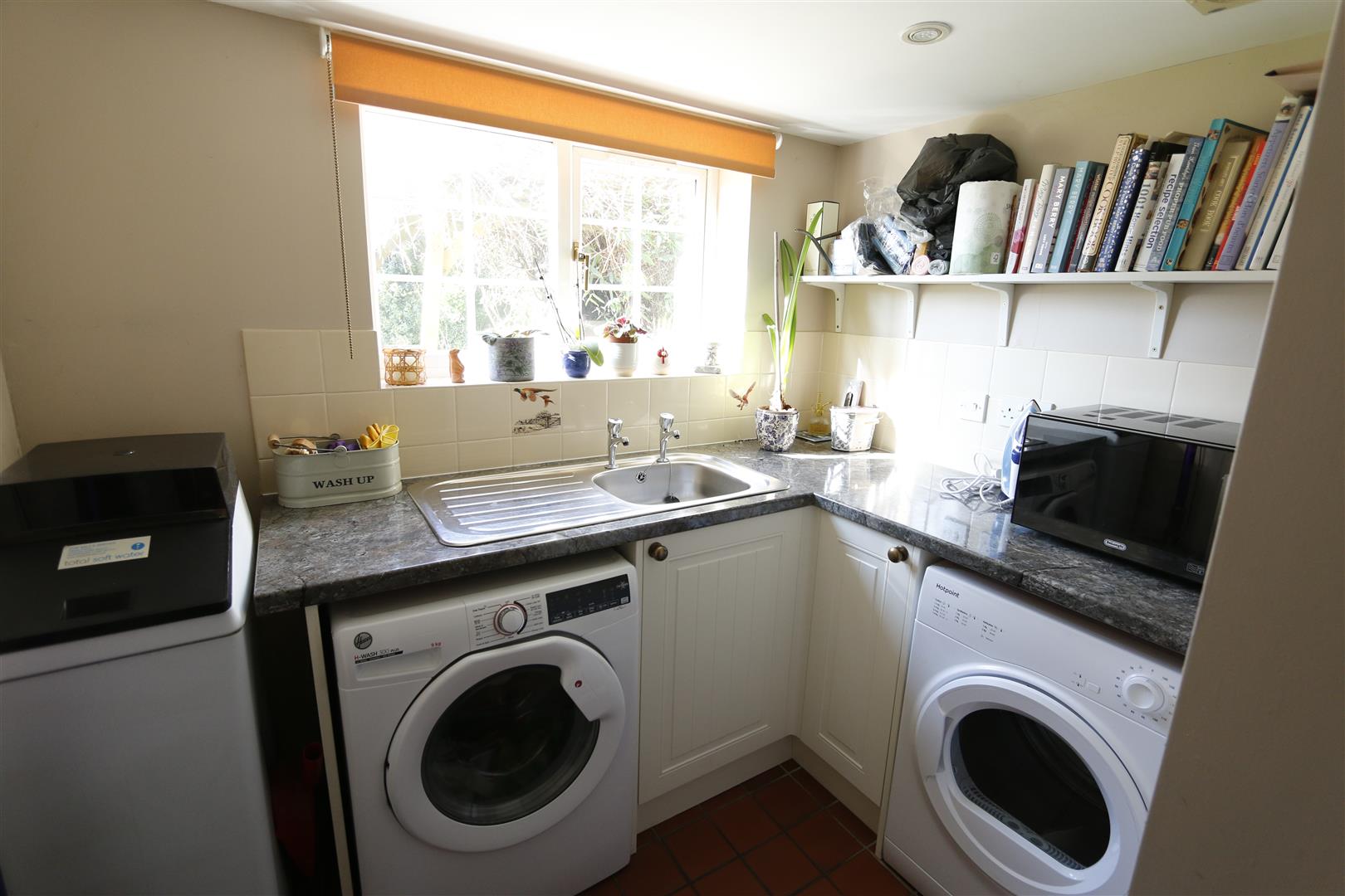 Window to rear, fitted base unit with roll top work surfaces, stainless steel sink unit, inset spotlights, plumbing for washing machine, tiled splashback, tiled floor, large walk in pantry with window to side.