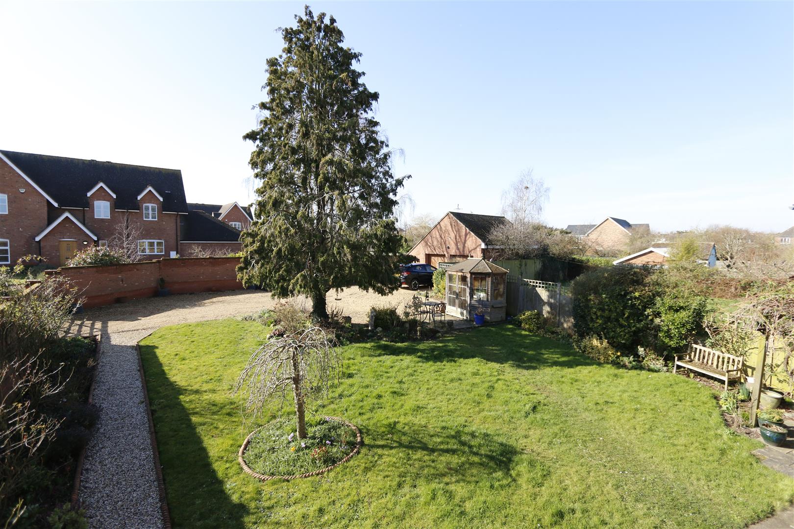 A large, fully enclosed garden laid mainly to lawn, variety of mature trees and shrubs, paved patio area, large gravelled driveway providing ample off road parking for several cars and leading to double garage.
