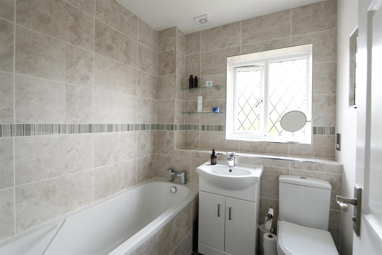 White suite comprising of panel enclosed bath with mixer tap, wall mounted shower, glass shower screen, wash hand basin in vanity unit, low level w.c, heated towel rail, fully tiled walls, window to rear.