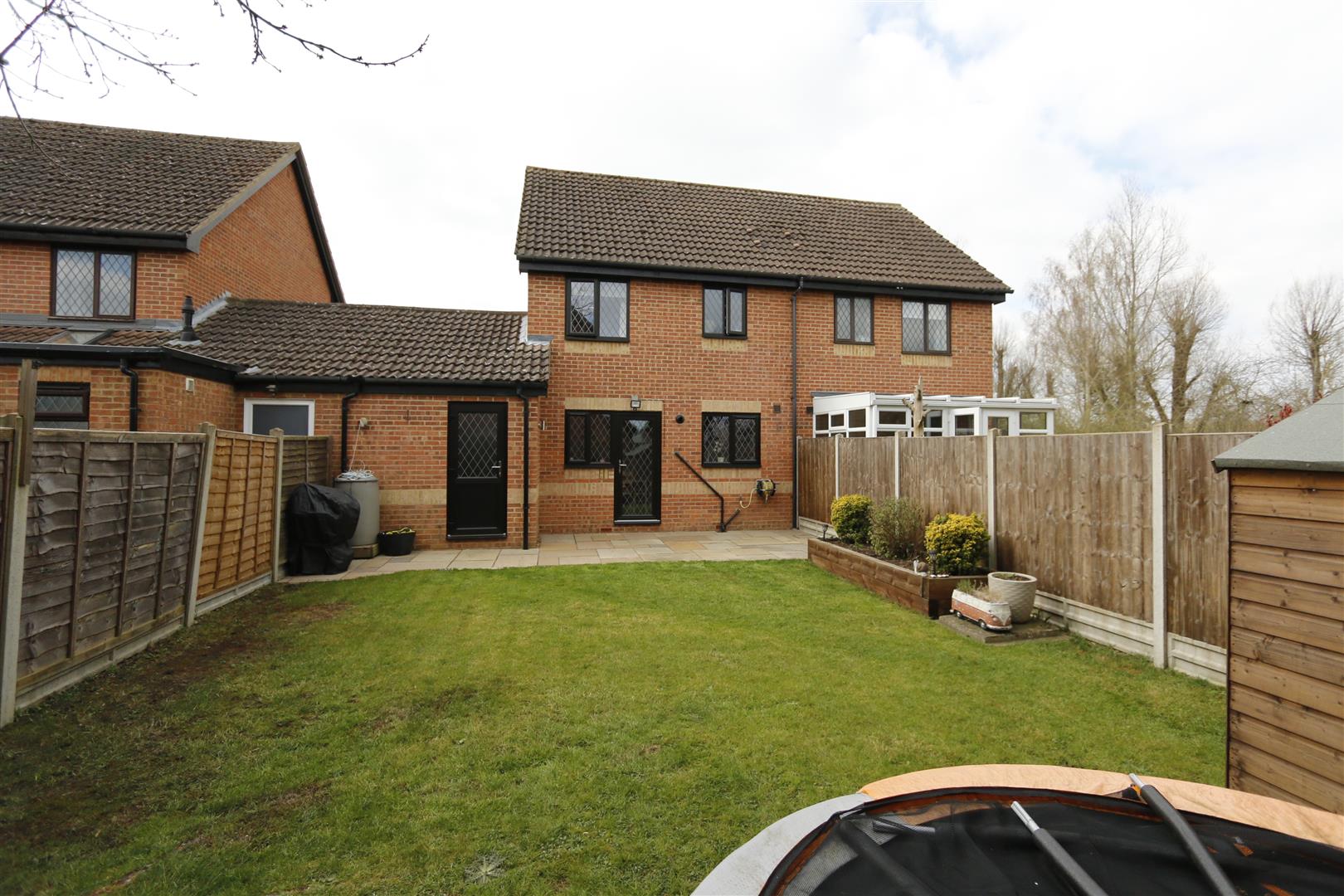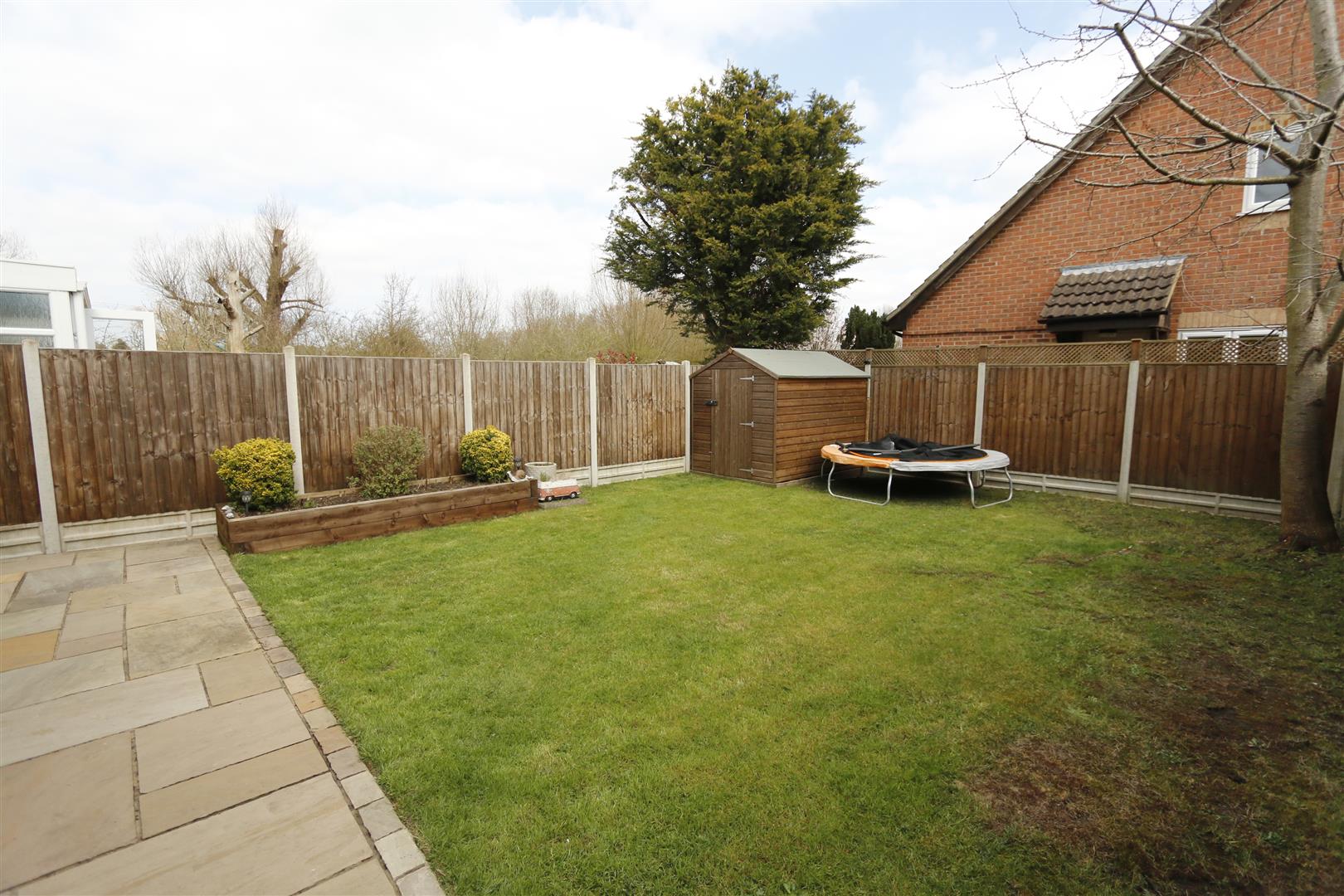 A fully enclosed garden with paved patio area, rest laid to lawn, raised sleeper flower bed, garden shed.