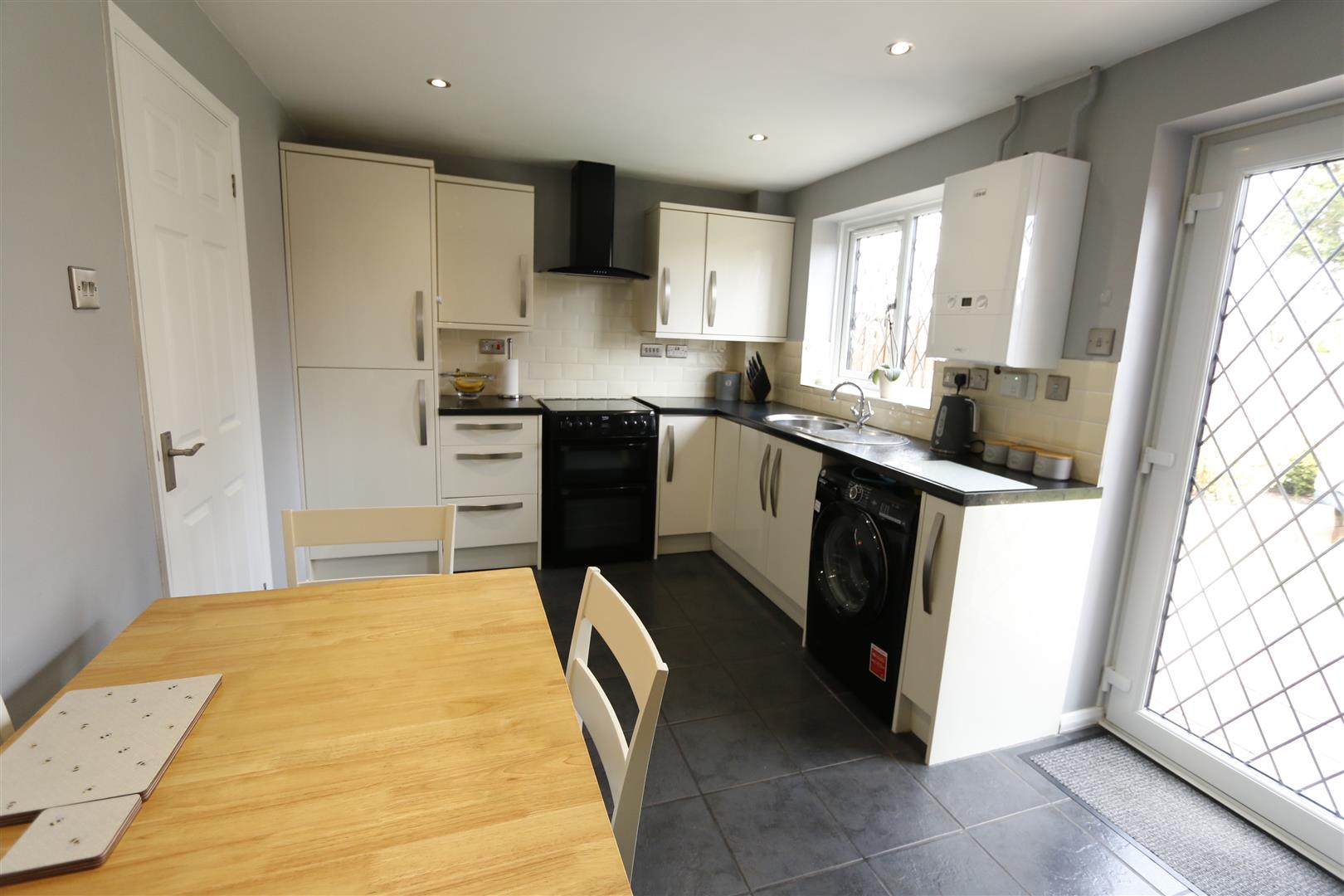 A well fitted kitchen with a range of base and eye level units with roll top work surface, stainless steel sink unit with mixer tap, tiled splash back, tiled floor, electric cooker point, extractor hood, radiator, inset spotlights, two windows to rear, do