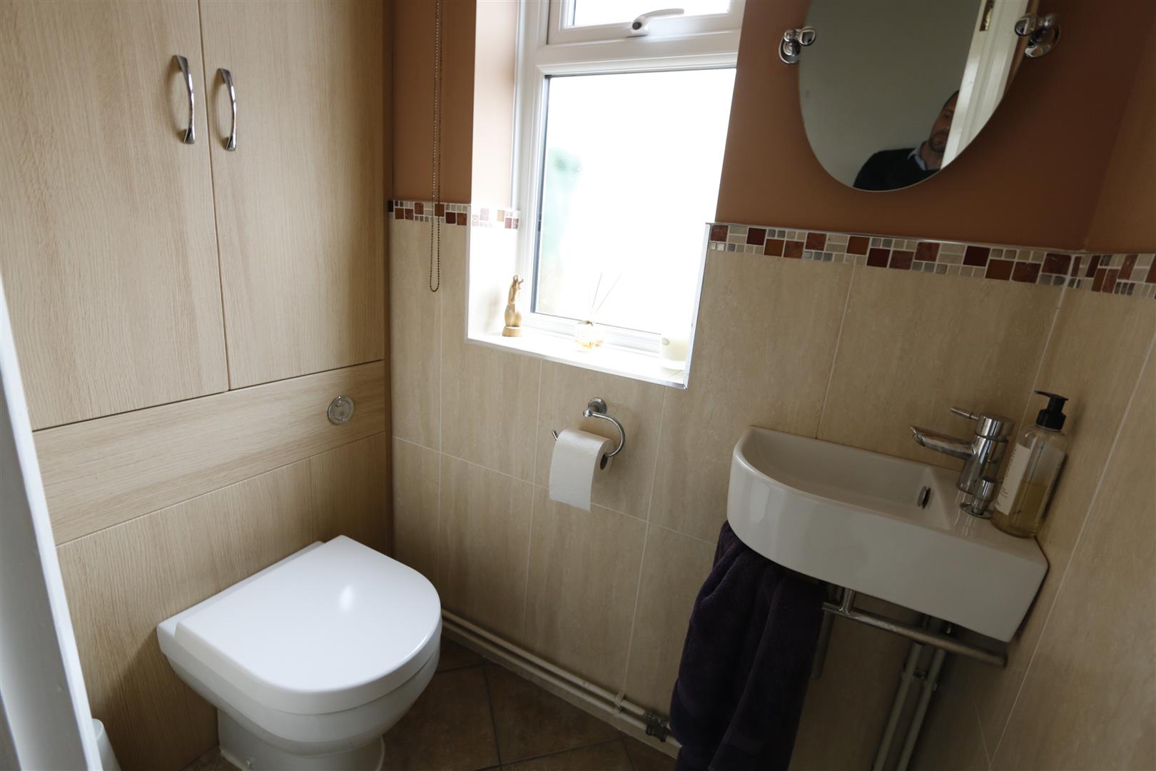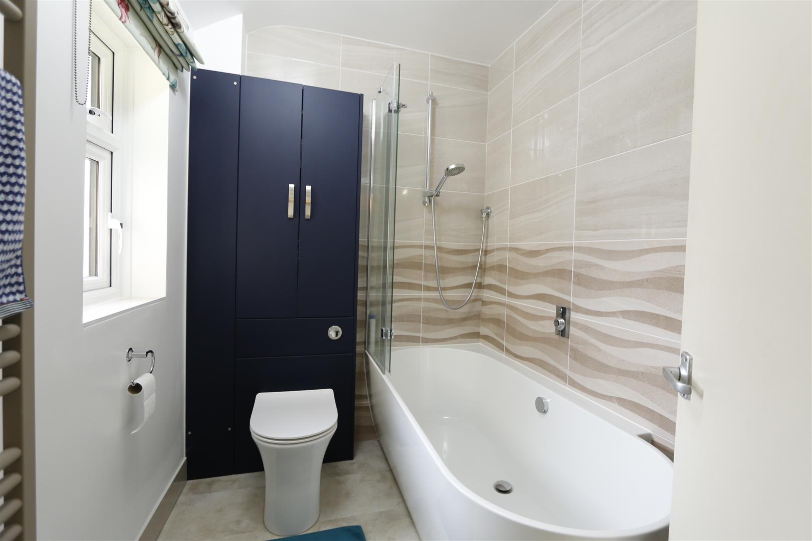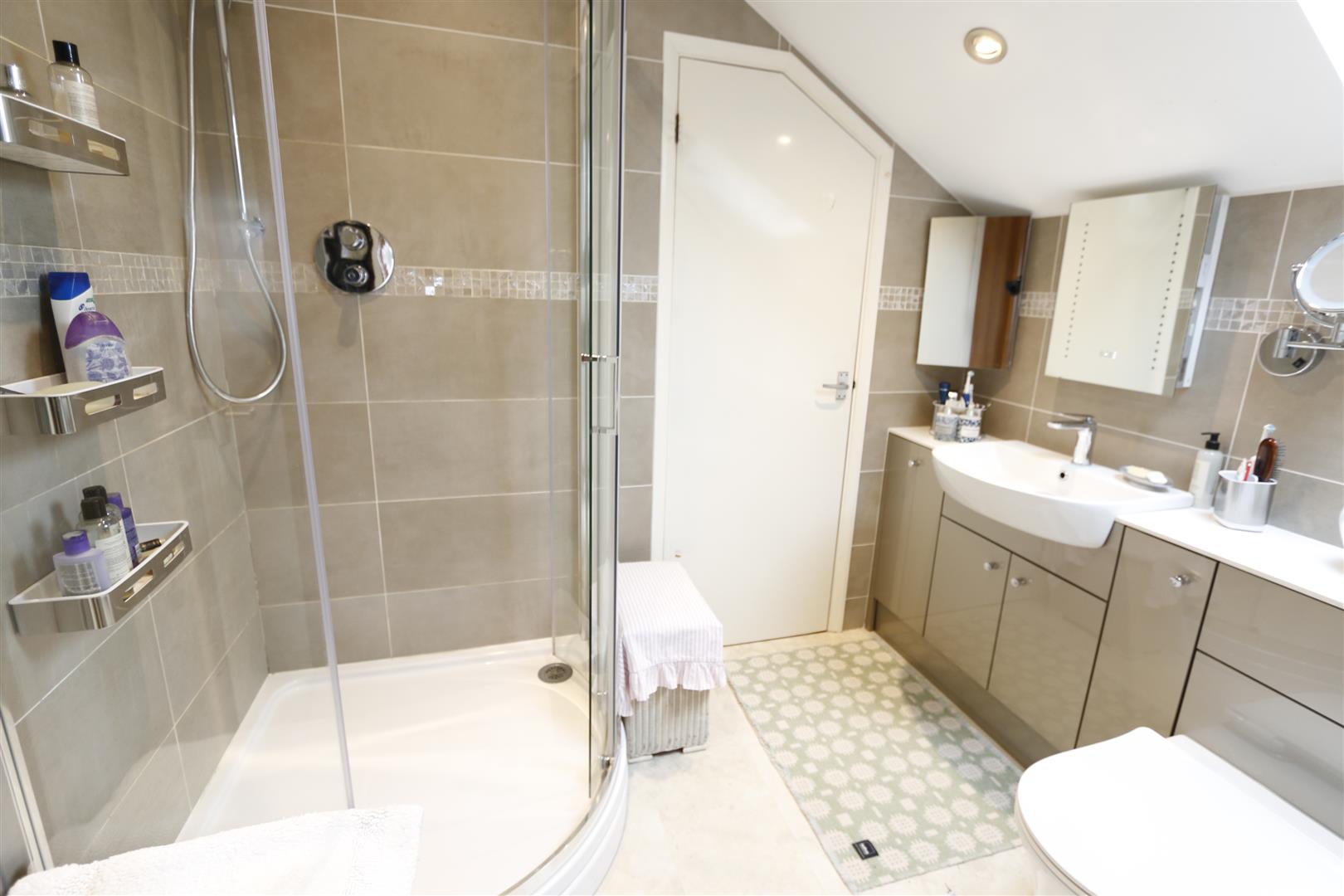 Suite comprising of fully tiled corner shower cubicle, low level w.c and wash hand basin in vanity unit, fully tiled walls, recessed cupboard, heated towel rail with electric override, Velux window to side.