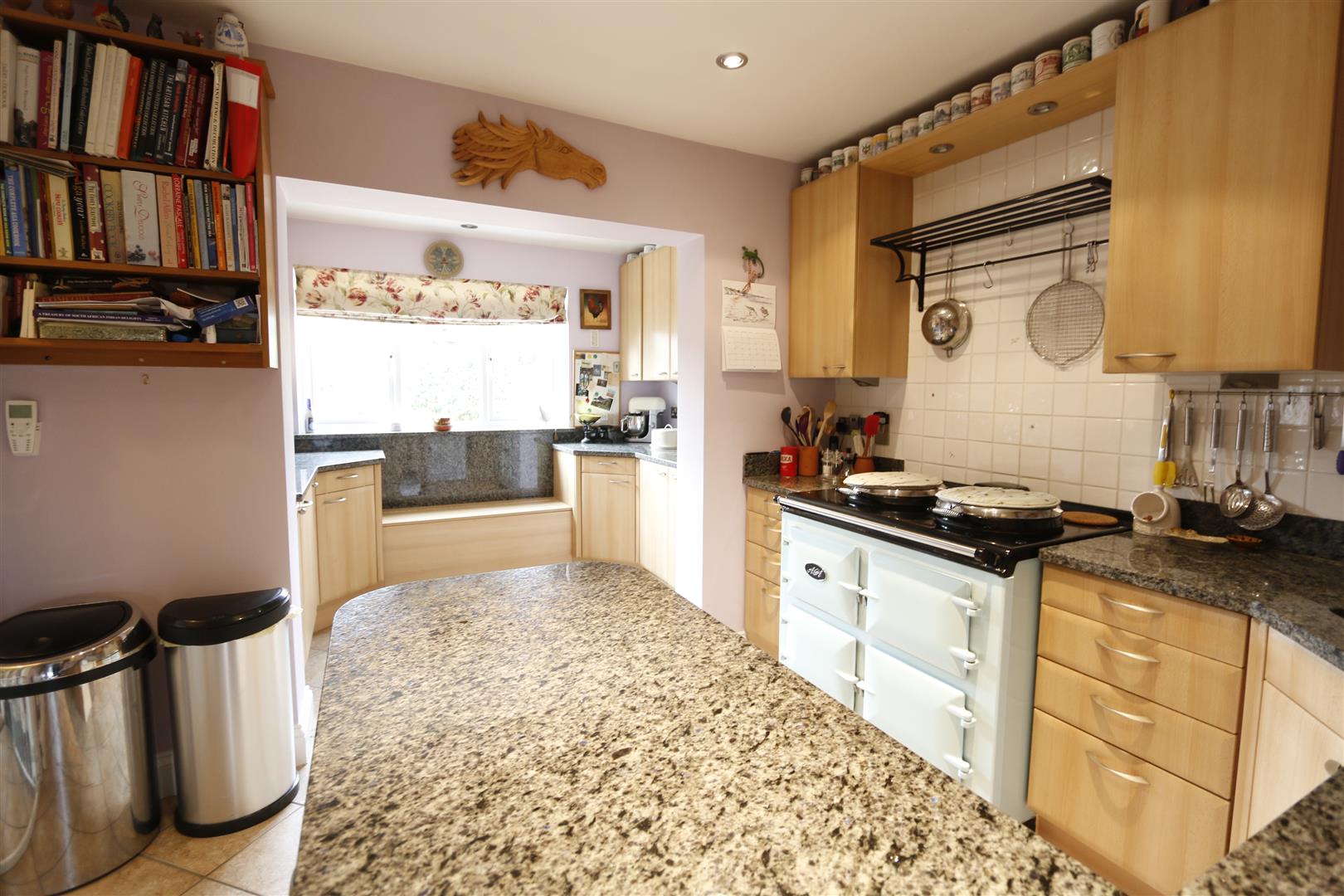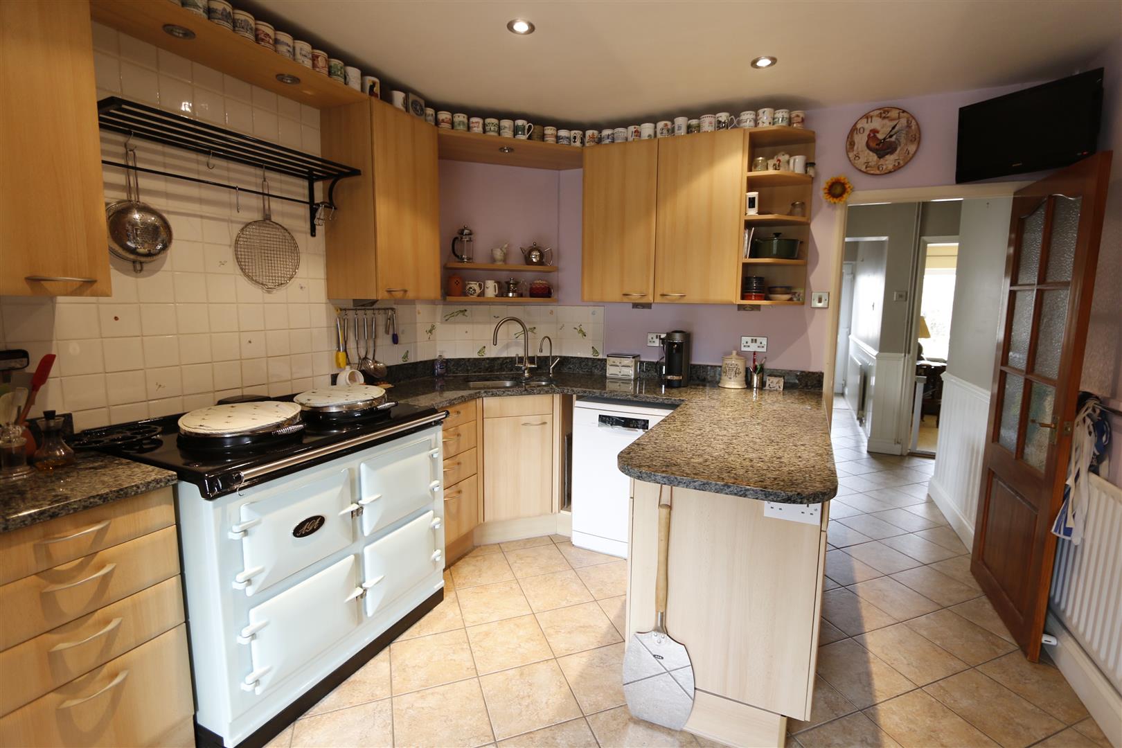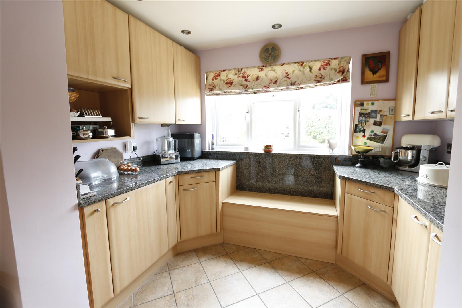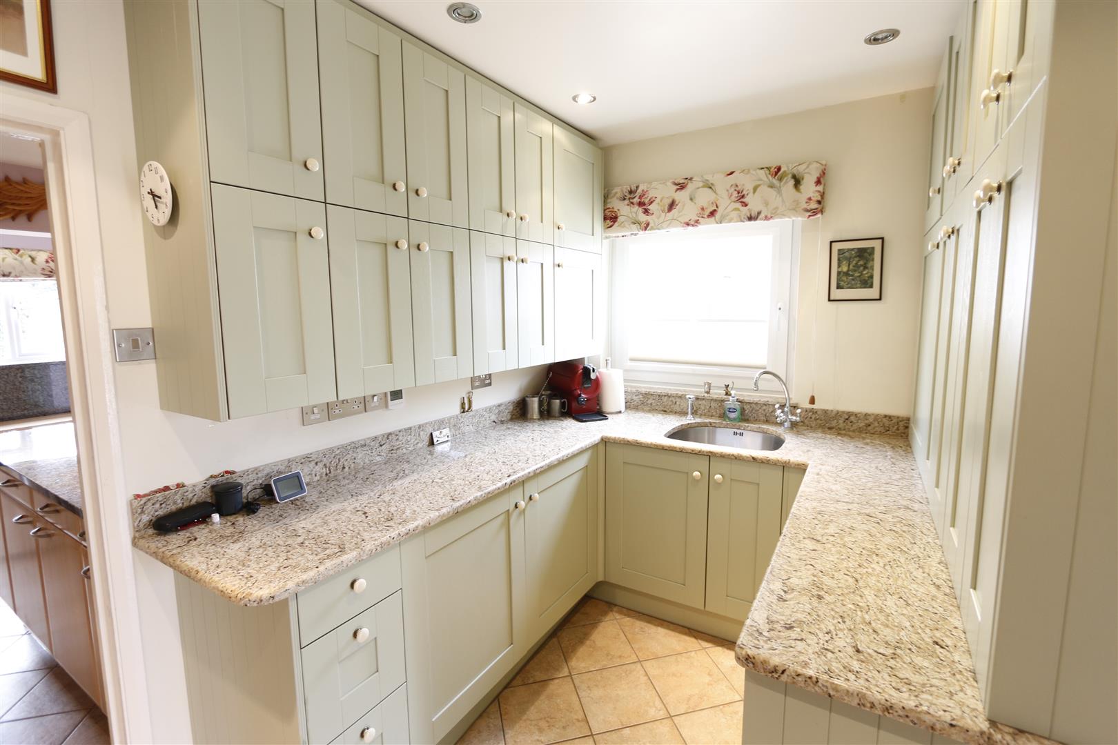 Range of base and eye level units with granite top work surfaces, inset sink with mixer tap and separate "Quooker" hot water tap, tiled splashback, plumbing for dishwasher, integrated fridge, tiled floor with under floor heating, inset spotlights, uPVC do