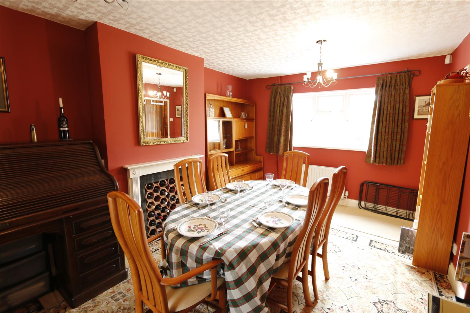 uPVC double glazed window to front, radiator, French doors into living room, open fireplace with wooden surround.