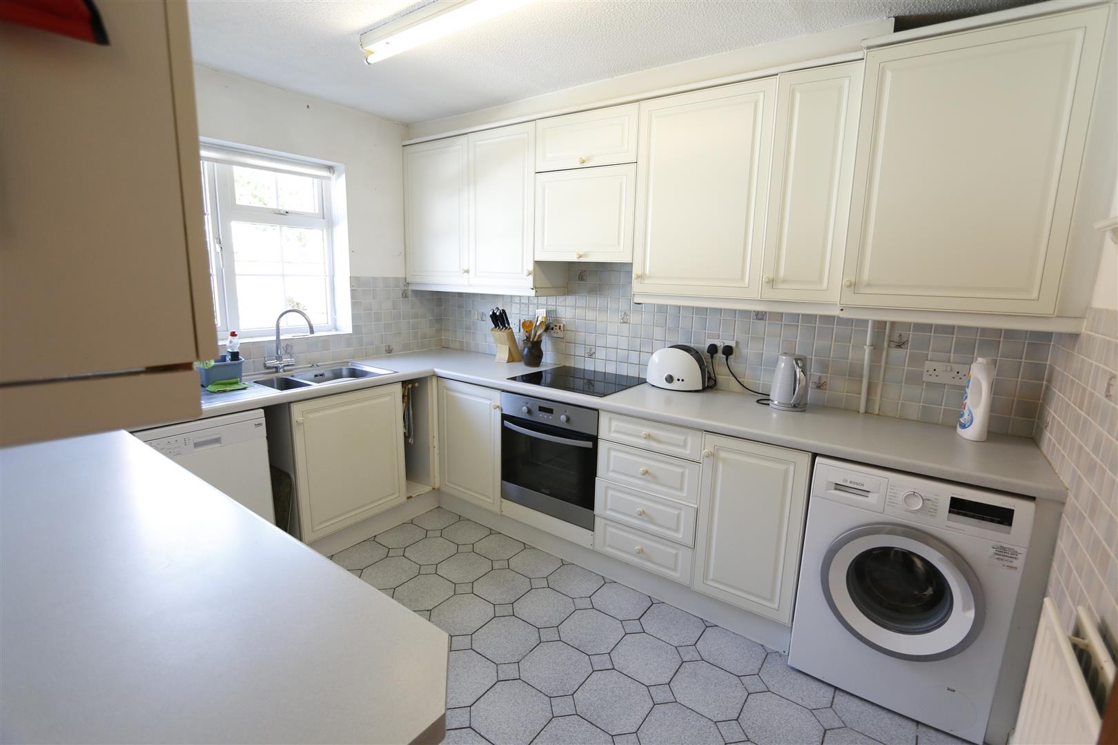 Fitted kitchen with a range of base and eye level units with roll top work surfaces, stainless steel sink unit with mixer tap, tiled splash back, integrated oven and hob, plumbing for washing machine and dishwasher, radiator, window to front.