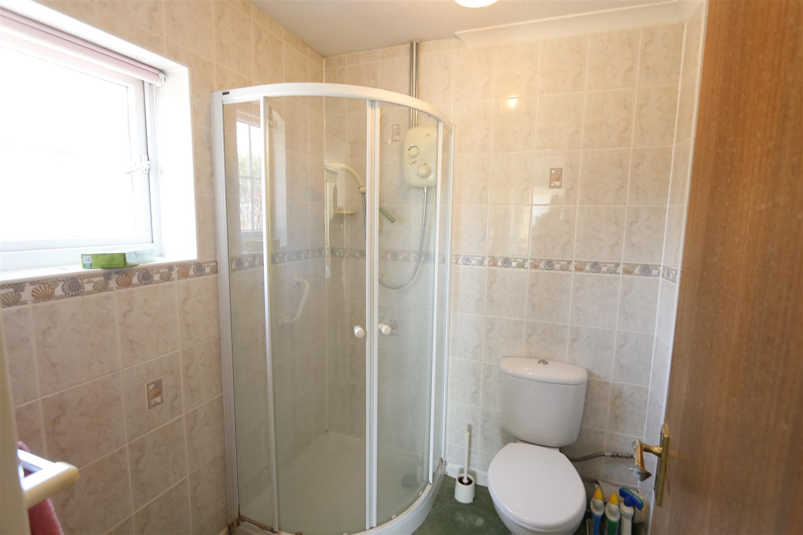 White suite comprising of fully tiled shower cubicle with wall mounted shower, low level w.c, pedestal wash hand basin, fully tiled walls, radiator, window to side.