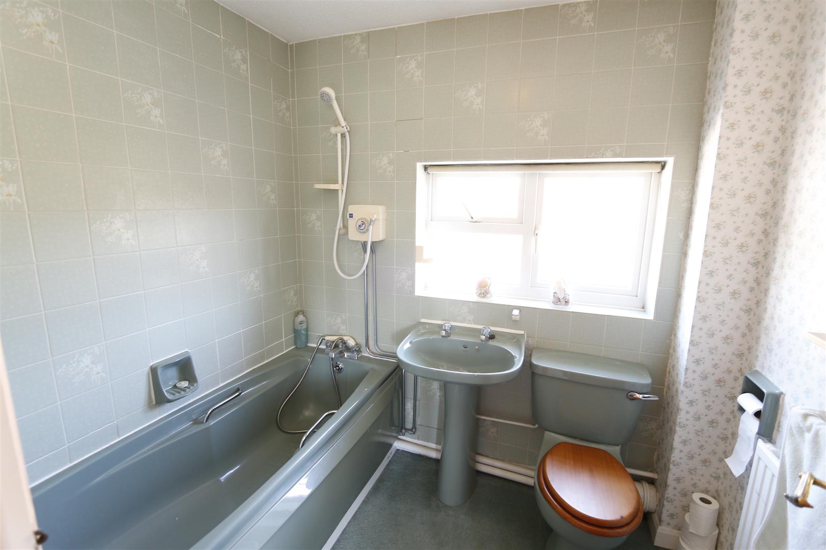 Suite comprising of low level w.c, wash hand basin with tiled splash back, radiator, window to front.