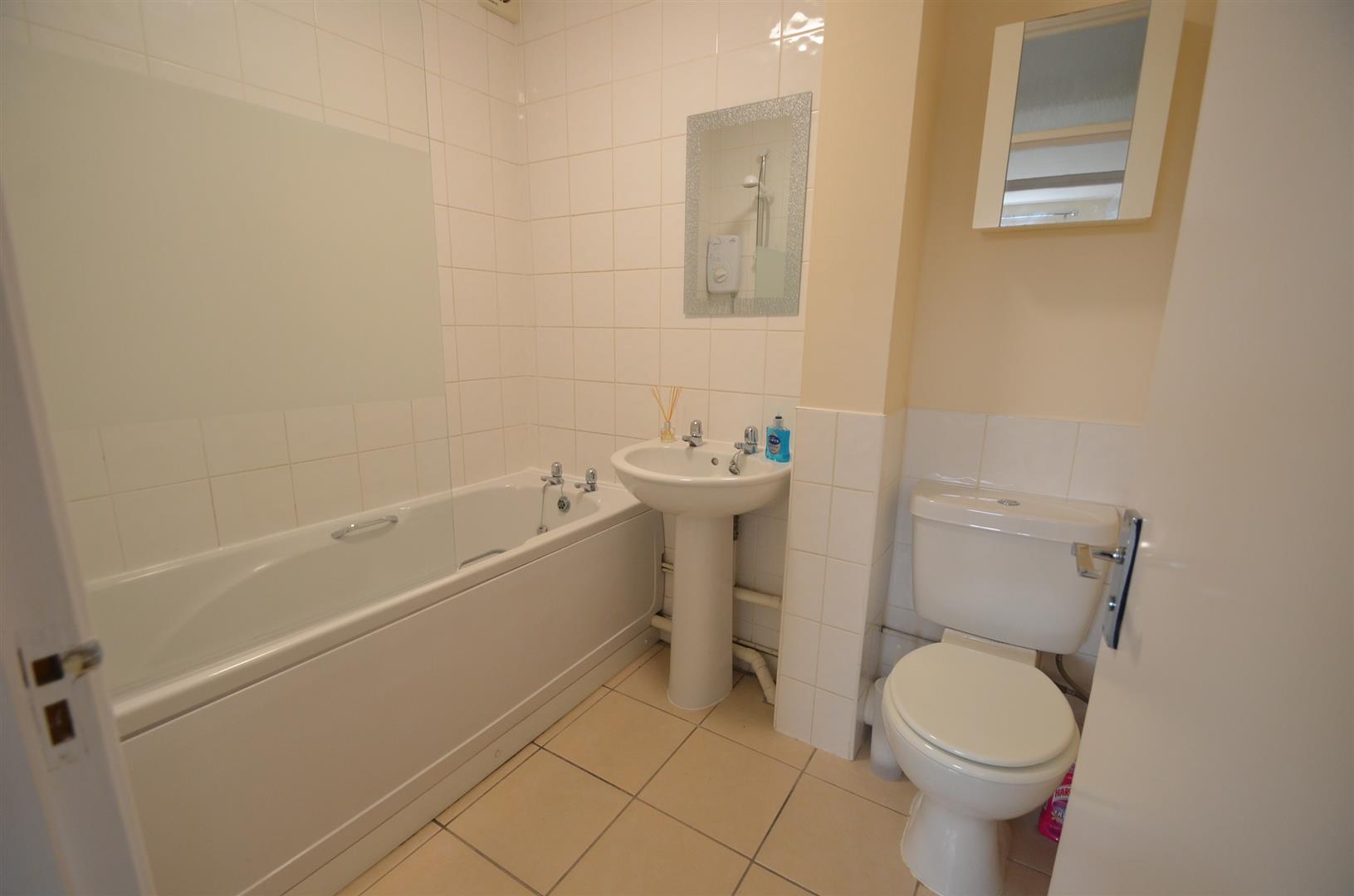 White suite comprising of panel enclosed bath, wall mounted shower, pedestal wash hand basin, low level w.c, tiled floor, part tiled walls.
