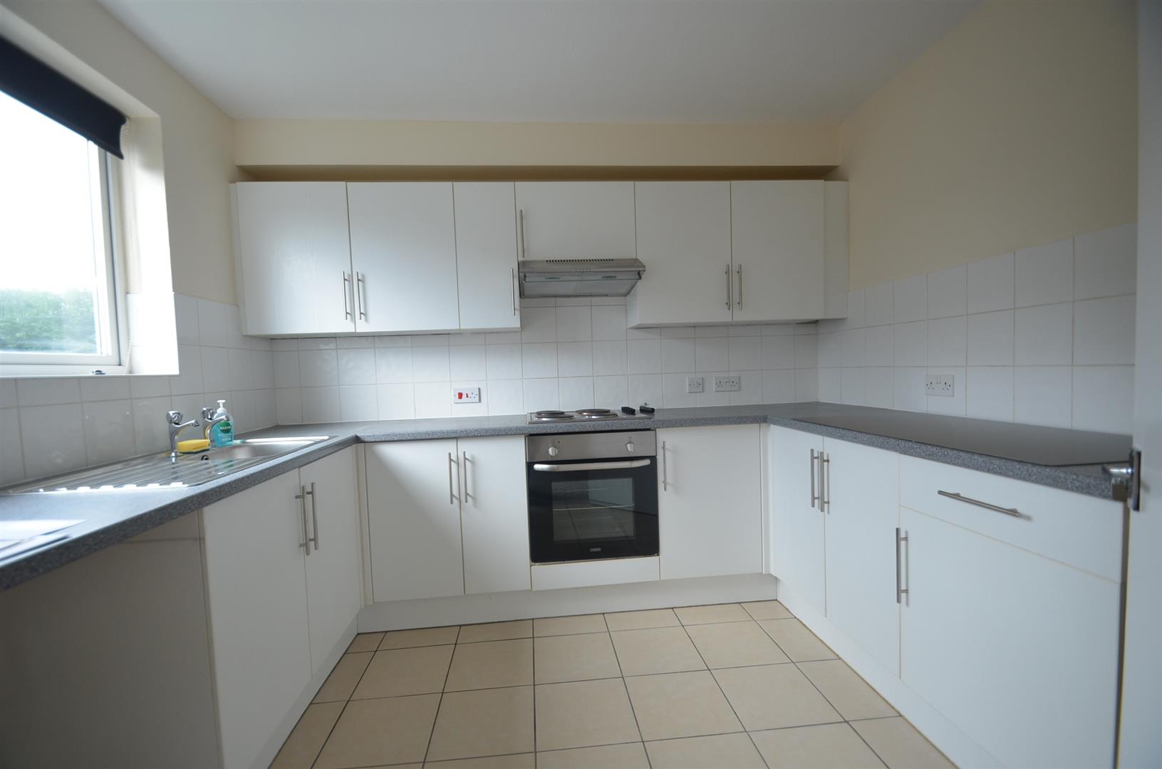 Well fitted kitchen with a range of base and eye level units with roll top work surfaces, stainless steel sink unit, tiled splash back, integrated oven and hob with extractor hood over, plumbing for washing machine, tiled floor, wall mounted gas boiler, w