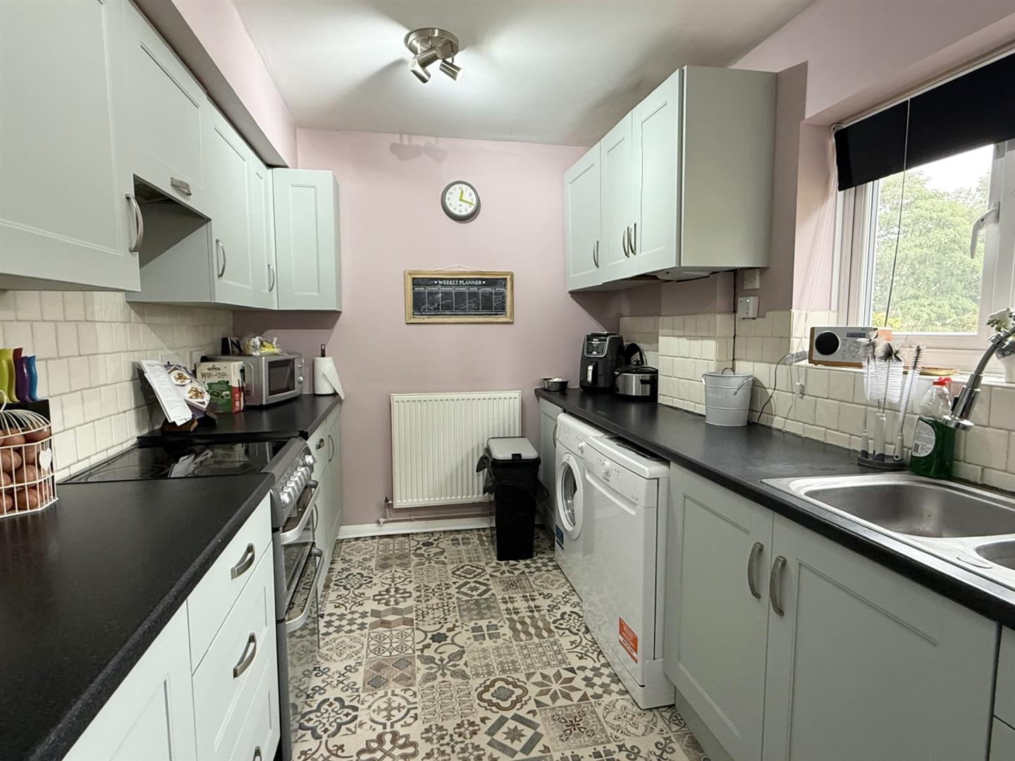 Fitted kitchen with a range of base and eye level units with roll top work surfaces, one and a half stainless steel sink unit with mixer tap, tiled splash back, cupboard housing wall mounted boiler, plumbing for dishwasher, electric cooker point, radiator