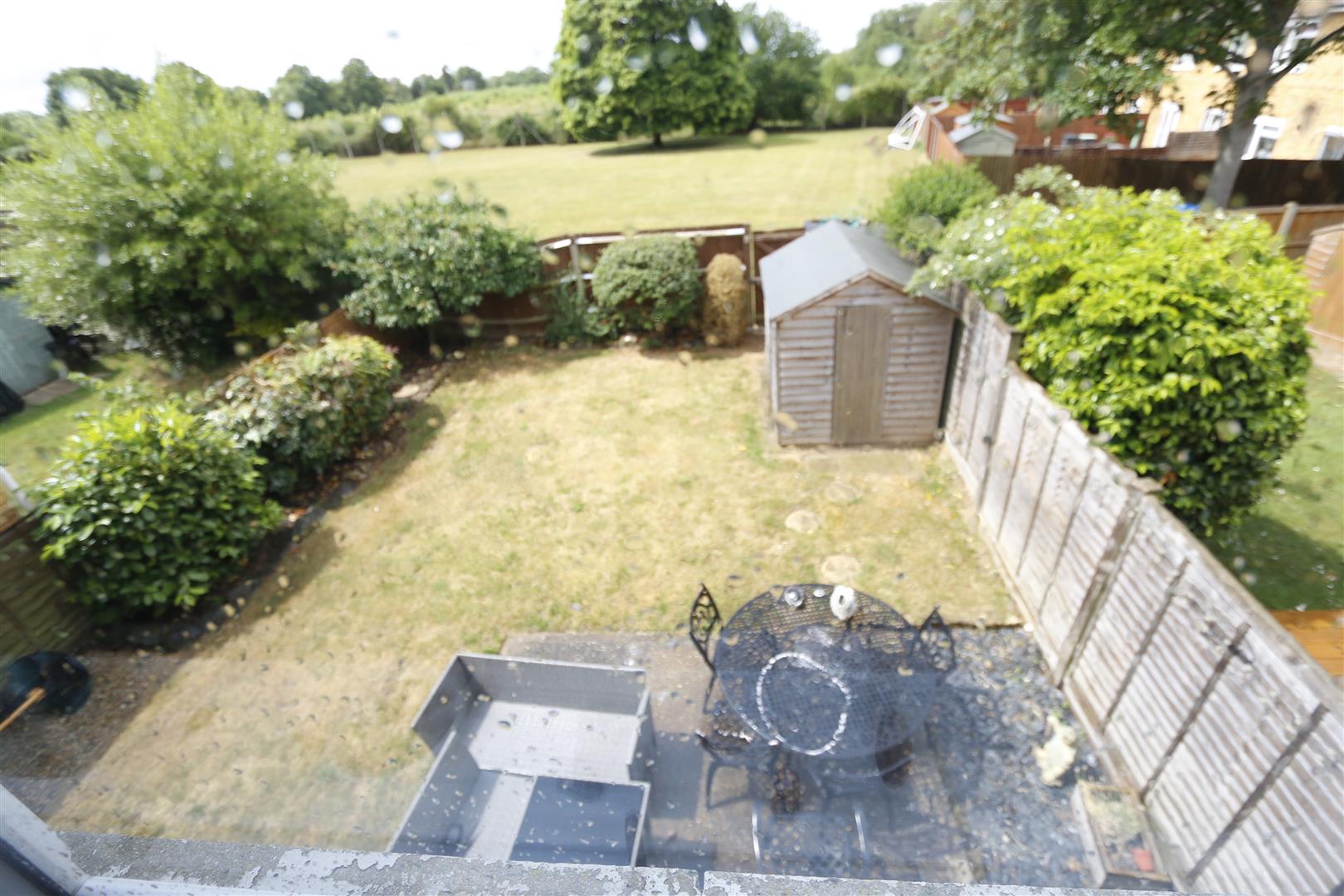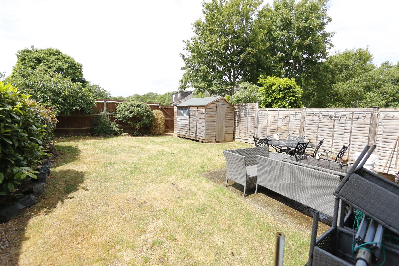 A fully enclosed garden laid mainly to lawn, flower bed borders, concrete hardstanding creating patio area.